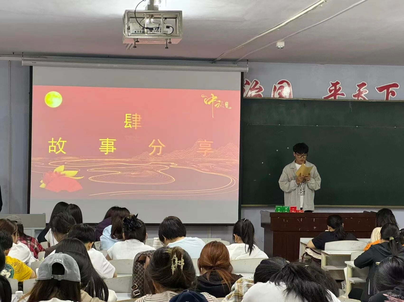 故事分享环节,第11至20组代表依次发言,既有对嫦娥奔月、吴刚伐桂等经典传说的全新解读,也有与家人共度中秋的温馨往事分享。学子们在聆听过程中,不仅深化了对中秋传统的认知,更学会从神话中探寻文化根脉,从生活点滴中领悟亲情的珍贵。