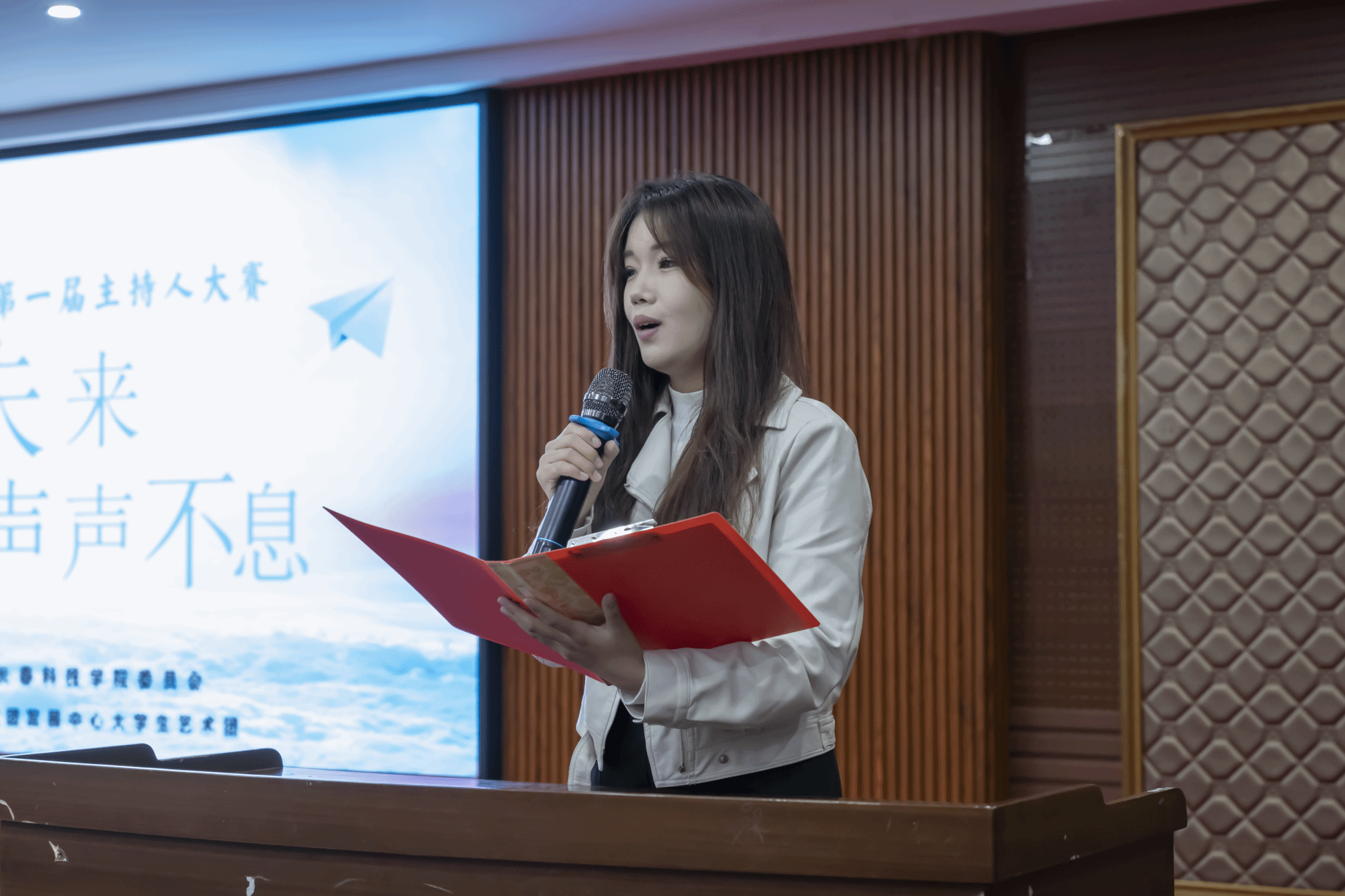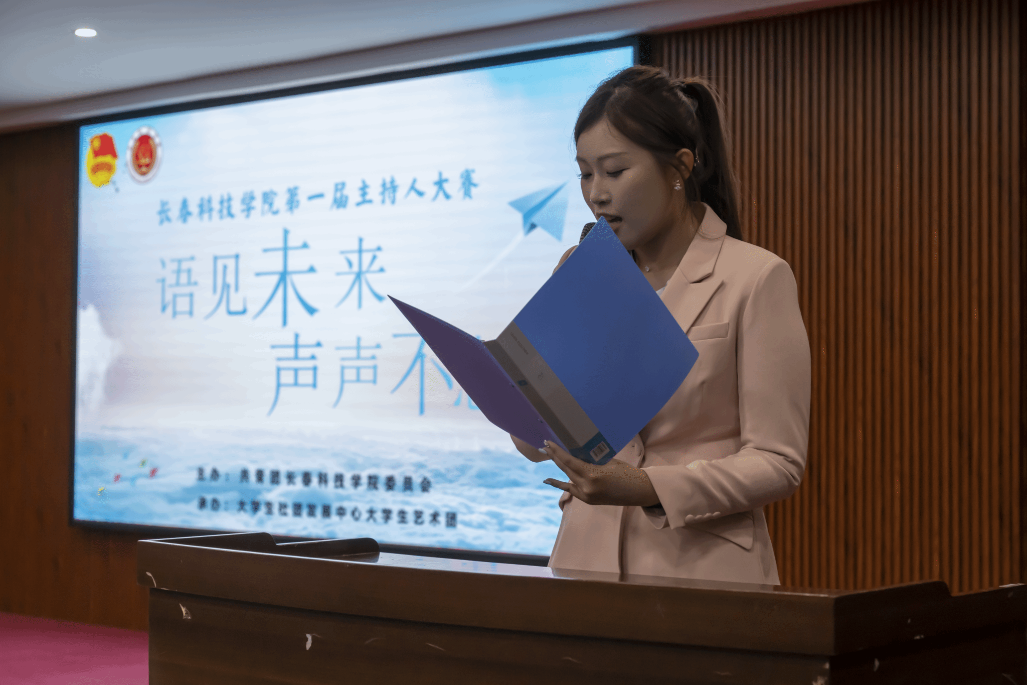 2025年10月17日晚,由共青团长春科技学院委员会主办、社团发展中心大学生艺术团承办的“语见未来,声声不息”第一届主持人大赛决赛在第一教学楼六楼报告厅圆满落幕。来自不同年级、学院、专业的选手们以饱满的热情与出众的才华,共同呈现了一场语言与风采交织的视听盛宴。