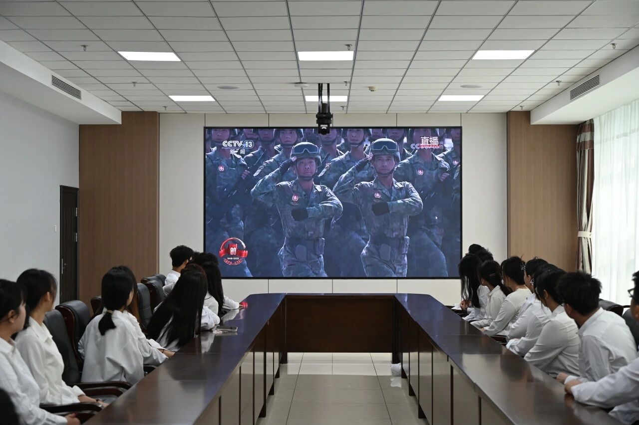 2025年9月3日,纪念中国人民抗日战争暨世界反法西斯战争胜利80周年大会在北京隆重举行。习近平总书记在大会上发表重要讲话: “中华民族伟大复兴 势不可挡!人类和平与发展的崇高事业 必将胜利!”,令人热血沸腾。为引导广大青年学子及团学骨干人员学习领会习近平总书记重要讲话精神,深刻感悟伟大抗战精神的时代光芒,激发爱国热情和奋斗豪情,9月3日上午,校团委组织65名团学干部及青年学生代表在行政楼405集中收看大会实况直播。