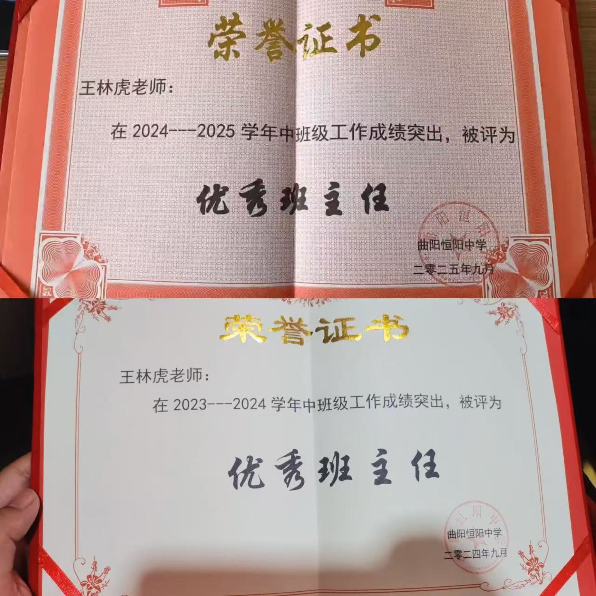 2023年6月毕业后,他正式入职曲阳恒阳中学,承担高中语文教学与班级管理双重职责。凭借勤勉务实的工作态度和过硬的专业能力,他逐步深耕基层教育领域,迅速成长为教学骨干,获评学校“骨干教师”称号。同时,因班级管理成效显著,他连续两年共计四次被评为“优秀班主任”,成功实现了从优秀学子到教学标杆的稳步跨越。