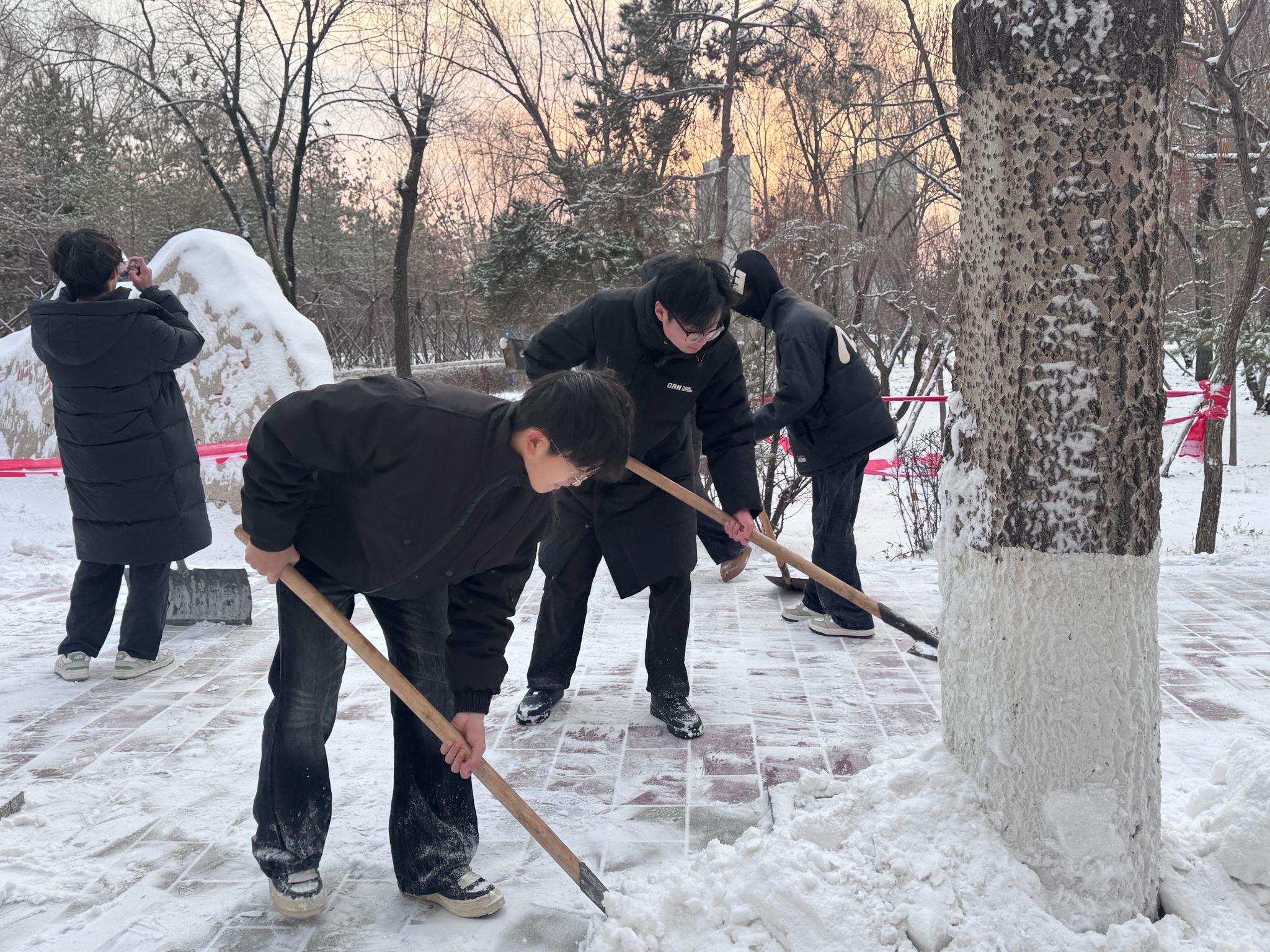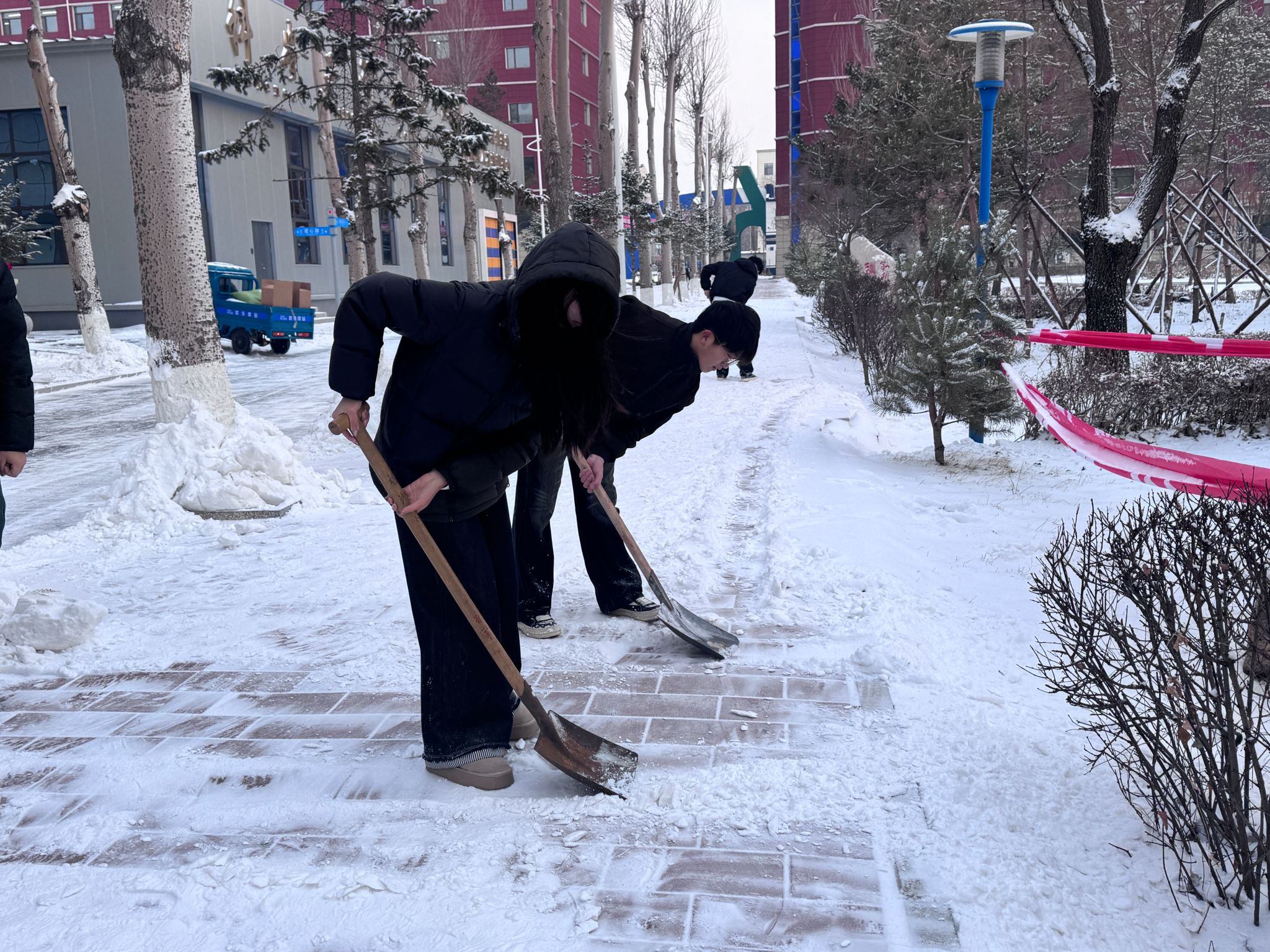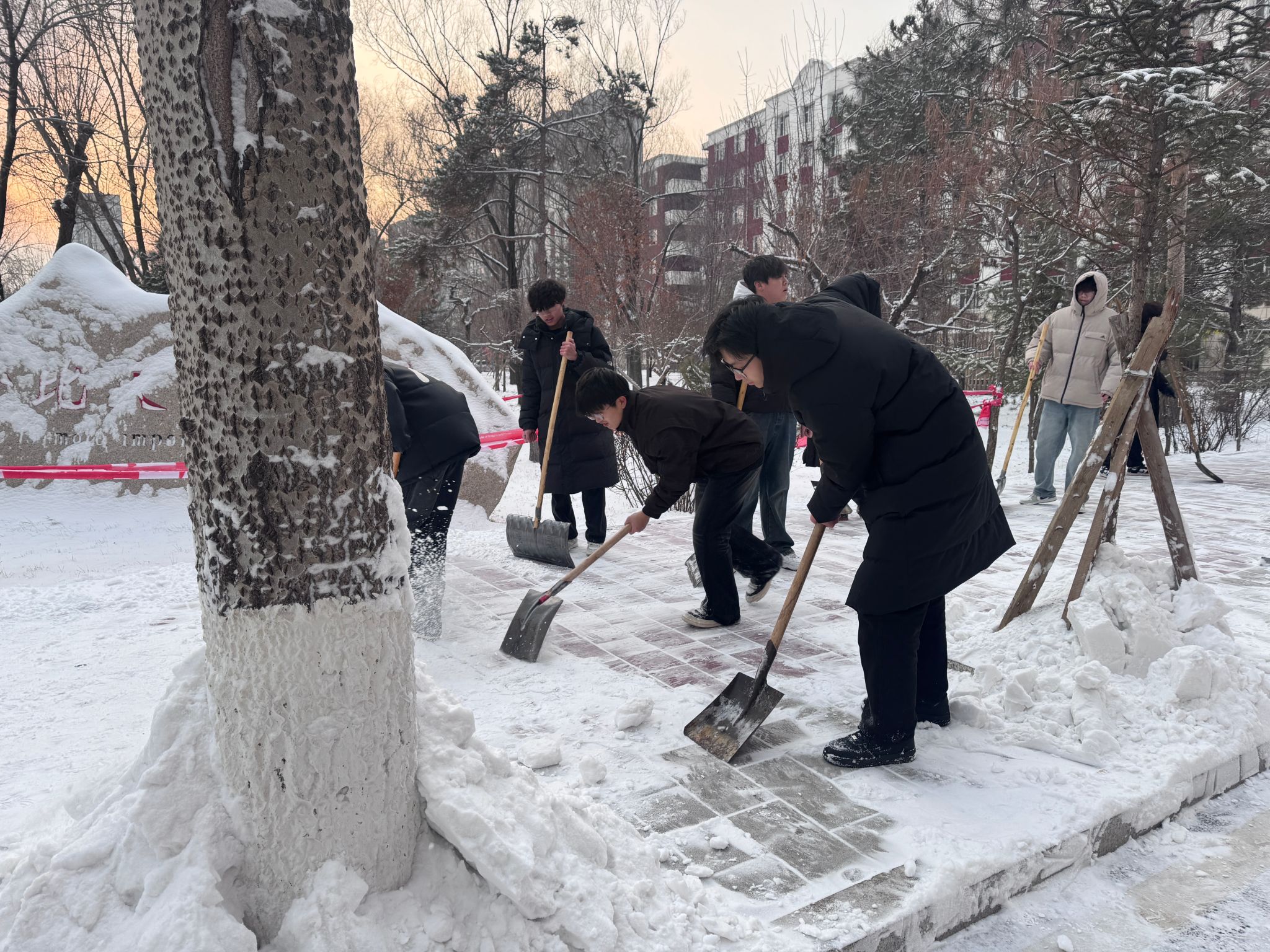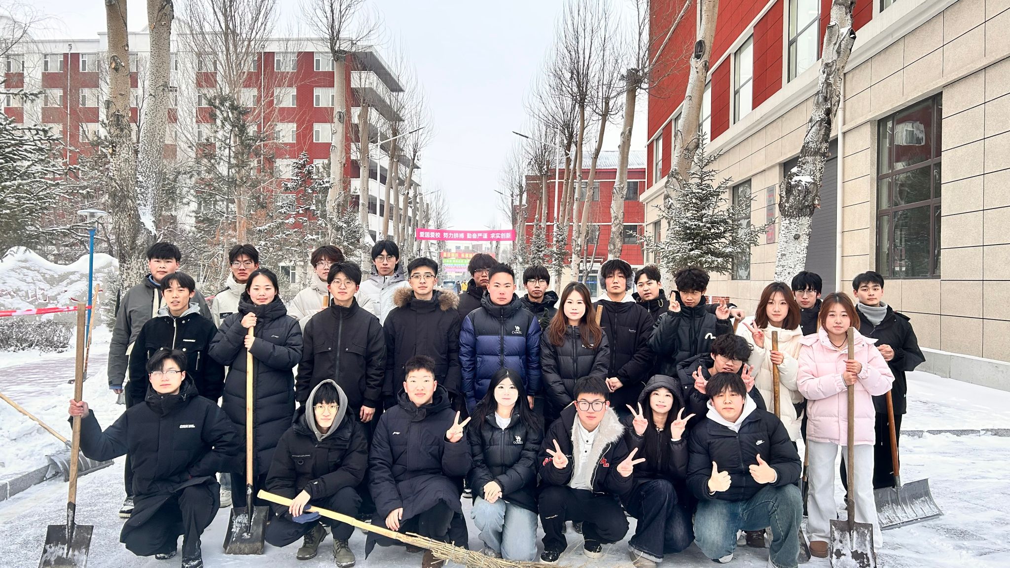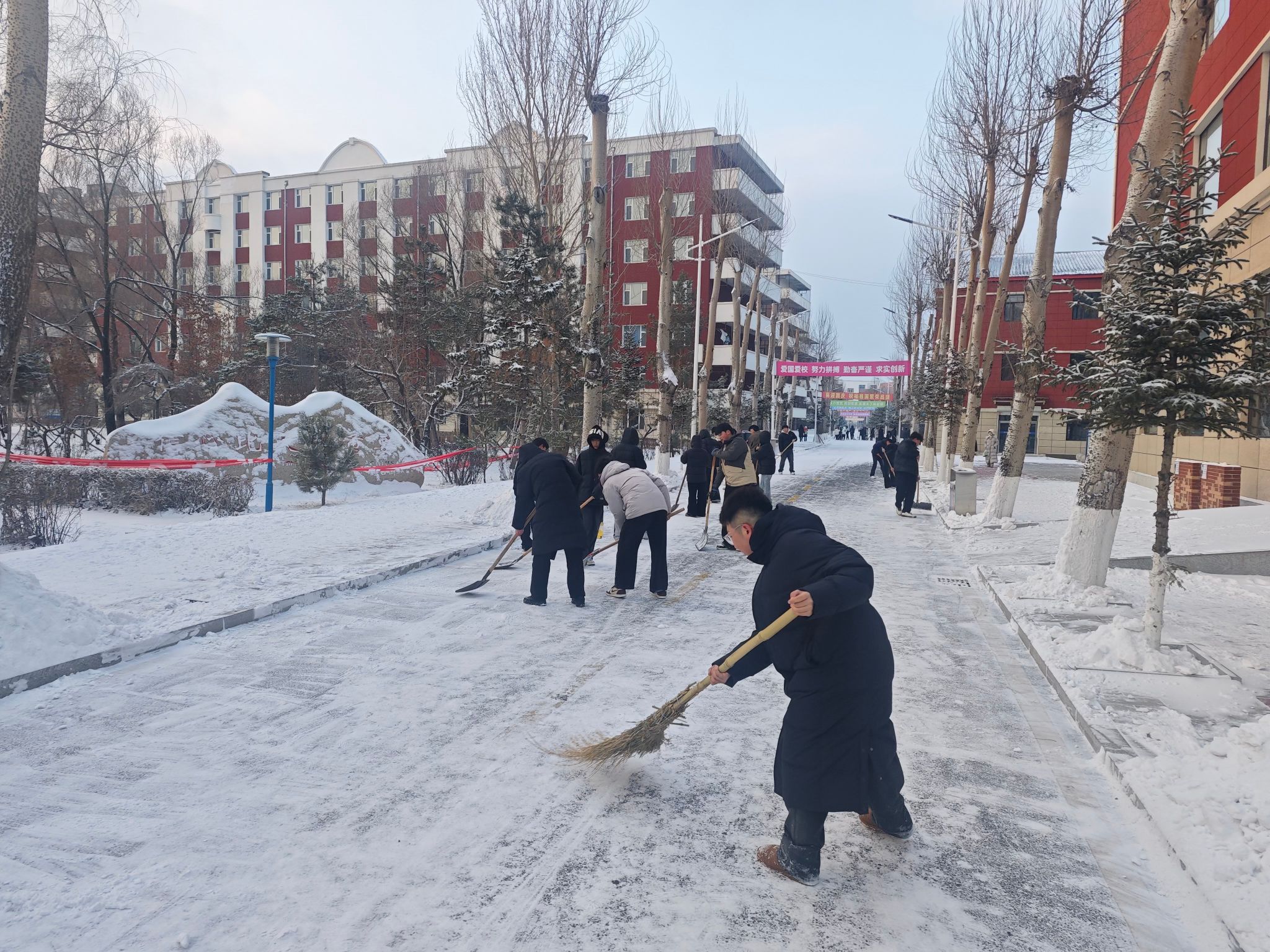 活动中,同学们不畏严寒,手持雪铲、扫帚等工具,热情高涨地投入到清扫工作中。大家分工协作,配合默契,奋力清扫路面积雪。尽管寒风凛冽,但同学们劳动的热情丝毫不减,忙碌的身影构成了冬日校园里一道亮丽的风景线。经过一番辛勤劳作,原本湿滑难行的路面变得干净、畅通,为师生开辟出了一条条“平安路”、“暖心道”。