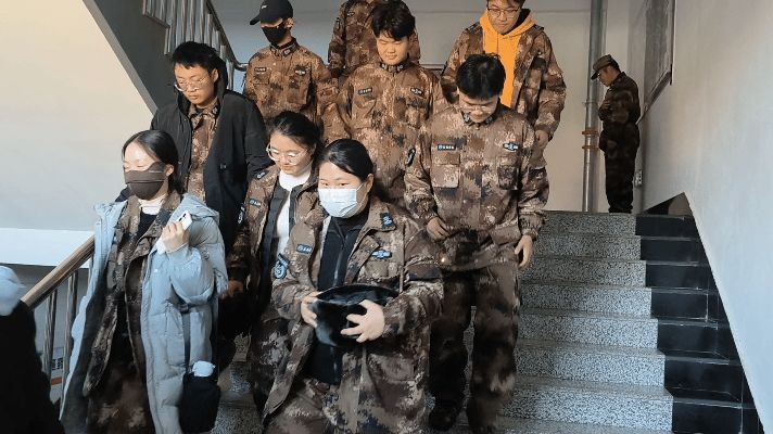 接到撤离指令后,同学们在学生干部的有序引导下,迅速弯腰、低头、捂住口鼻,沿着预定疏散路线快速撤离。