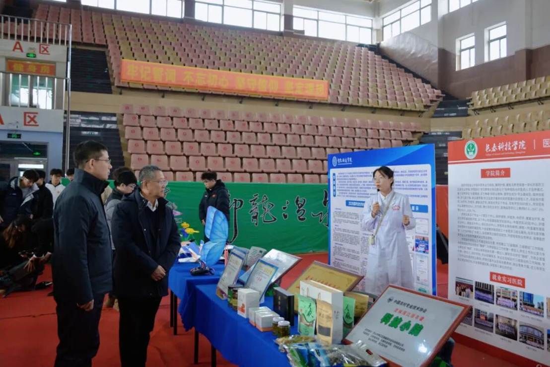 现场同步设置的医药学院展示区,与会领导莅临展区参观,仔细听取学院介绍,了解我院人才培养情况;企业代表也纷纷驻足观看,直观感受我院学生的专业实力与创新潜力。