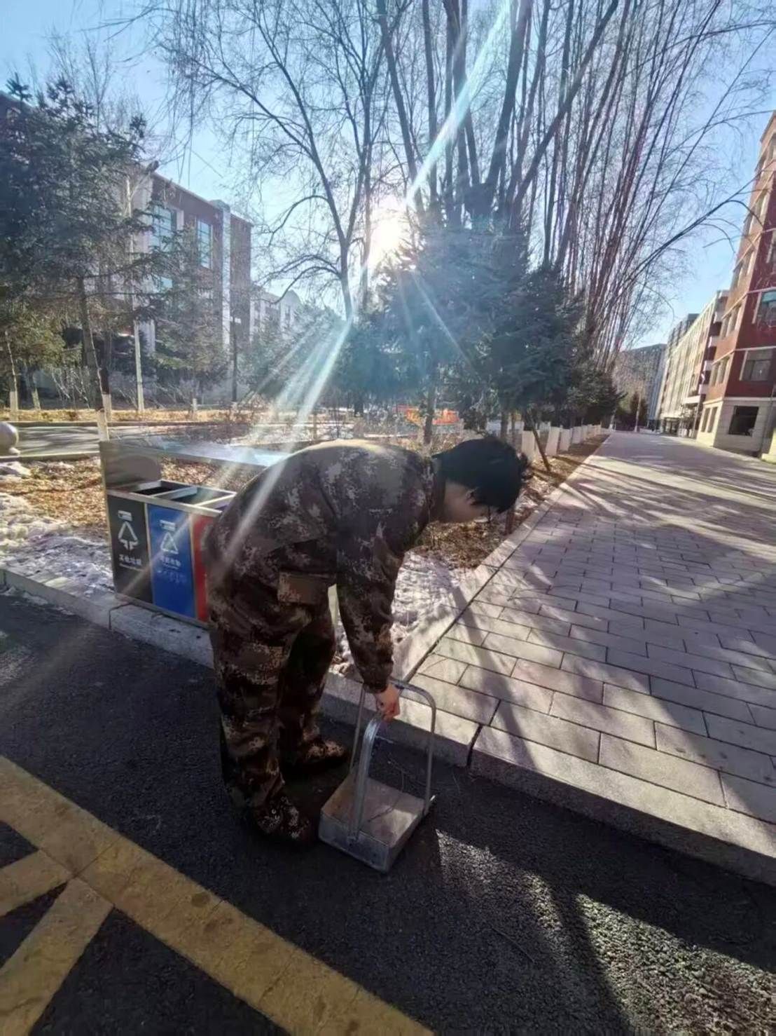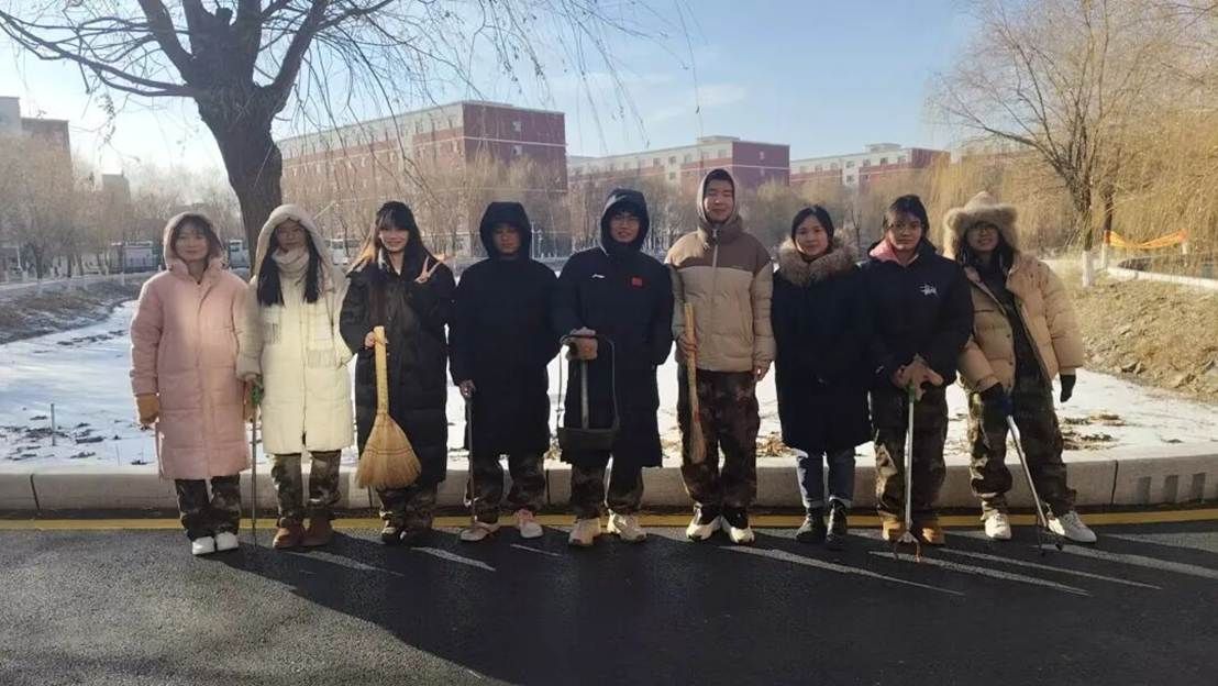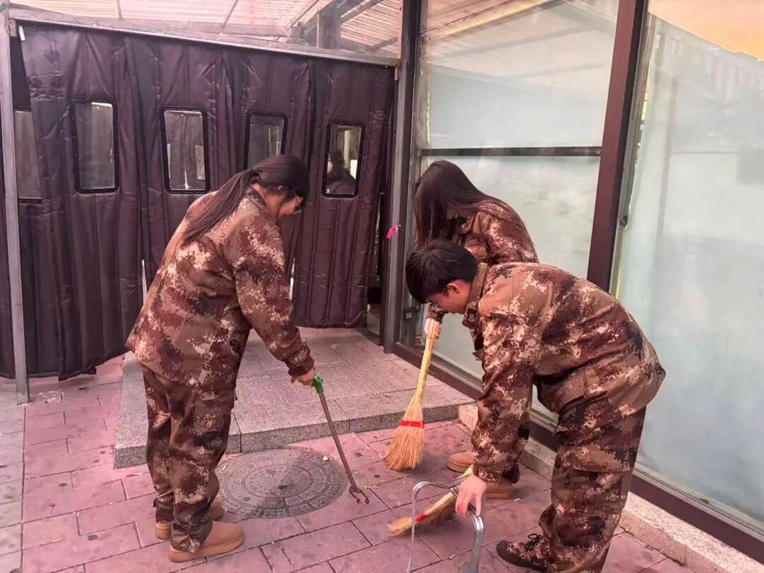 教学楼前的步道旁,同学们手持扫帚与簸箕,分工协作:有人清理落叶残枝,有人规置杂物垃圾,扫帚扫过路面的沙沙声,与彼此的提醒声交织,让清冷的校园晕开暖意,以劳动的默契书写青春的生动篇章。
