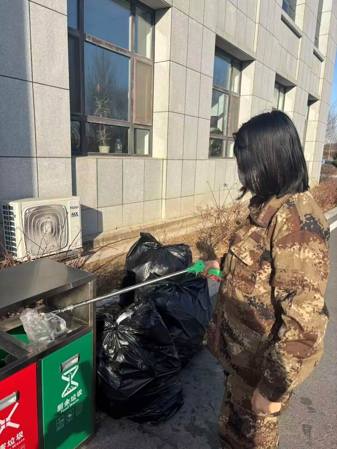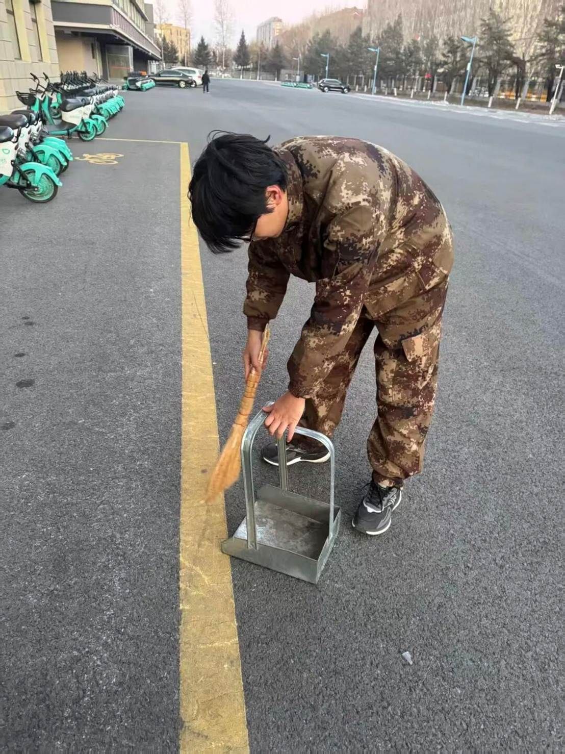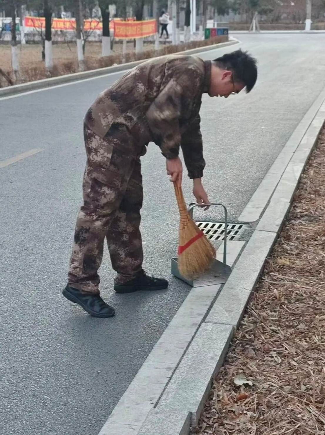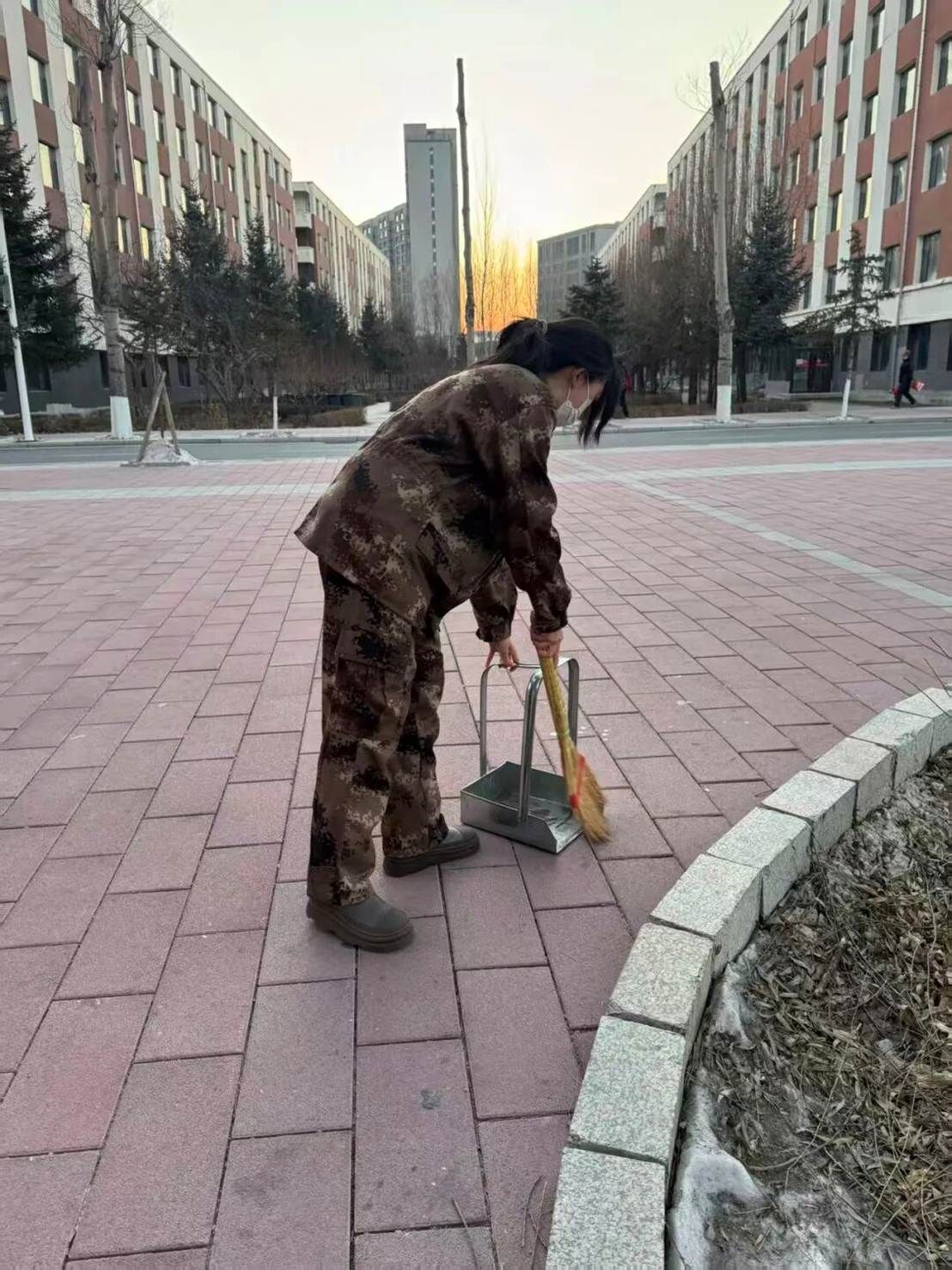 教学楼东侧的林荫道旁,同学们手持清扫工具,分组协作。有人细心捡拾落叶与杂物,有人负责搬运垃圾,还有人弯腰擦拭公共长椅。沙沙的扫地声、轻轻的交谈声与欢快的笑声交织在一起,奏响了一曲劳动协奏曲。阳光下,他们的身影渐次铺展,让原本落叶堆积的步道渐渐整洁明亮。
