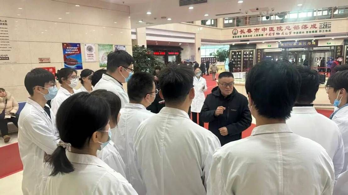 在长春市中医院的大厅,中医学专业的实习学生身着规整的白大衣,有序围聚起来。王德友主任走到学生中间,强调了此次实习是中医学专业从理论走向实操的关键衔接,叮嘱大家要把握这段临床历练的契机——在跟诊中多感知真实诊疗的节奏,主动参与实践环节的协作,同时也提醒同学们要做好实习过程的记录,把这段经历里的积累转化为自身专业能力的沉淀,让书本知识与临床实际形成更紧密的联结。