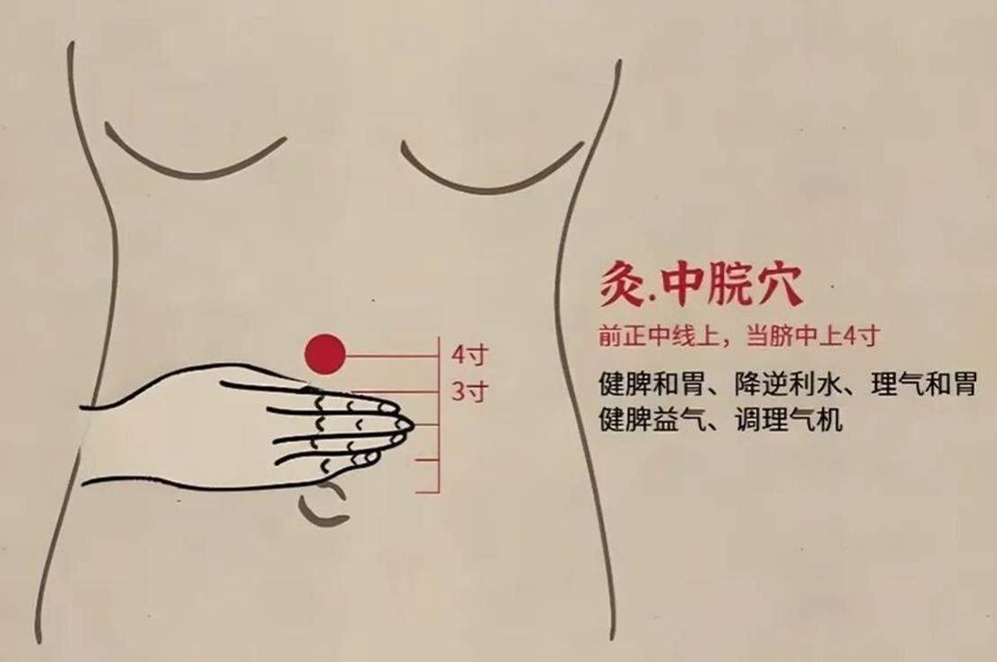 中脘穴:定位:肚脐上方4寸,即手掌横放,肚脐上四指处,按摩方法:用手掌顺时针按揉,每次100圈,力度轻柔,每天1-2次,功效:调理脾胃、缓解腹胀,改善消化吸收功能,避免食物积滞。
