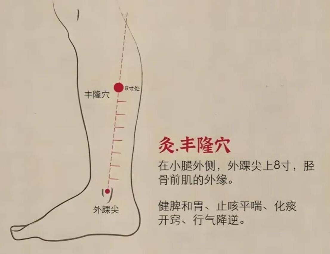 丰隆穴:定位:小腿外侧,膝盖下方8寸,即膝盖外侧凹陷处向下约8寸,胫骨与腓骨之间,按摩方法:用拇指指腹按揉,酸胀感明显,每次100次/侧,每天2次,功效:祛湿化痰的“特效穴”,能有效化解体内痰湿,改善腰腹肥胖、身体沉重的体质。