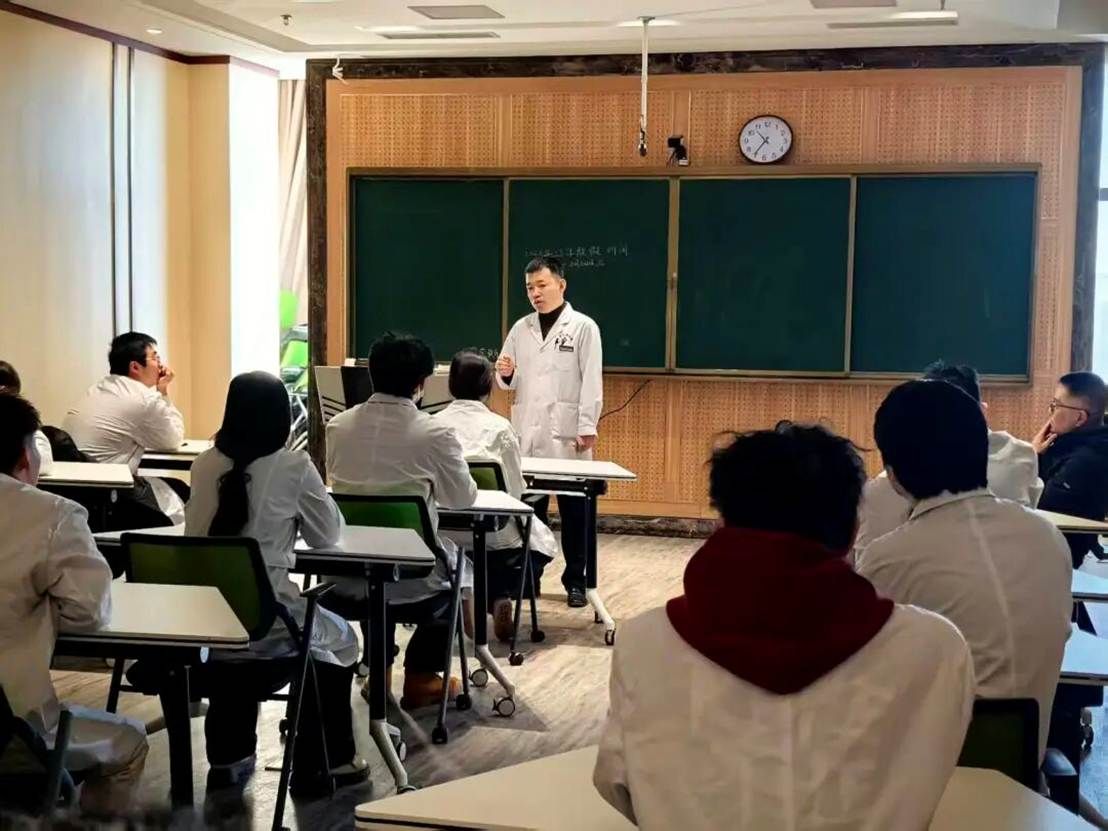 讲话后,三位老师与在院实习生进行了分组交流。同学们踊跃发言,分享了在科室的实习见闻和实操心得,也表达了在临床中遇到的困惑与收获。袁磊老师仔细询问了同学们的生活安排和适应情况,并再次强调了假期期间的纪律要求与安全意识,鼓励大家以积极心态面对挑战,在实战中提升综合能力。