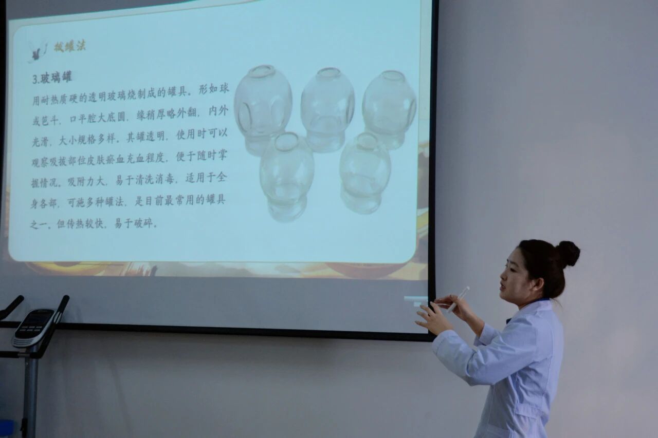 之后,李妍老师还现场拿起玻璃罐进行实操演示,一步步展示消毒、点火、吸附等规范操作流程,让同学们直观掌握了拔罐的基础技巧,也对罐具的实际使用有了更清晰的认知。