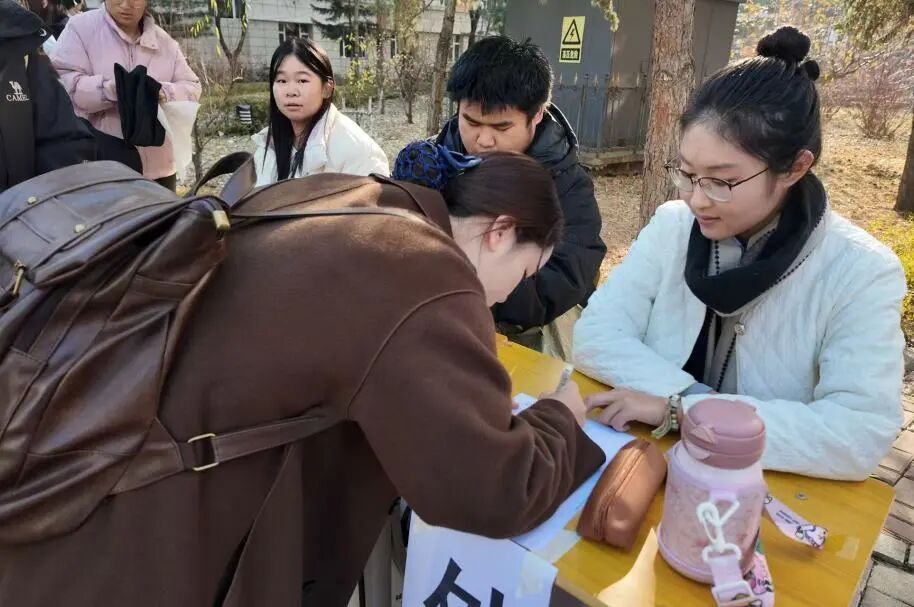 随着活动正式拉开帷幕,同学们怀揣着温暖与善意,陆续从校园各处赶来。他们手中提着的,是早已清洗干净、折叠整齐的衣物——既有厚实的羽绒服、保暖的毛衣,也有柔软的外套与裤子,每一件衣物都散发着阳光的气息,承载着学子们的爱心与关怀。在工作人员的热情引导下,捐赠的同学们有序排队,认真填写《“冬日暖行”捐衣登记表》,从姓名、班级到捐赠衣物的种类与数量,每一项信息都填写得清晰准确,用严谨的态度为这份爱心“登记备案”。