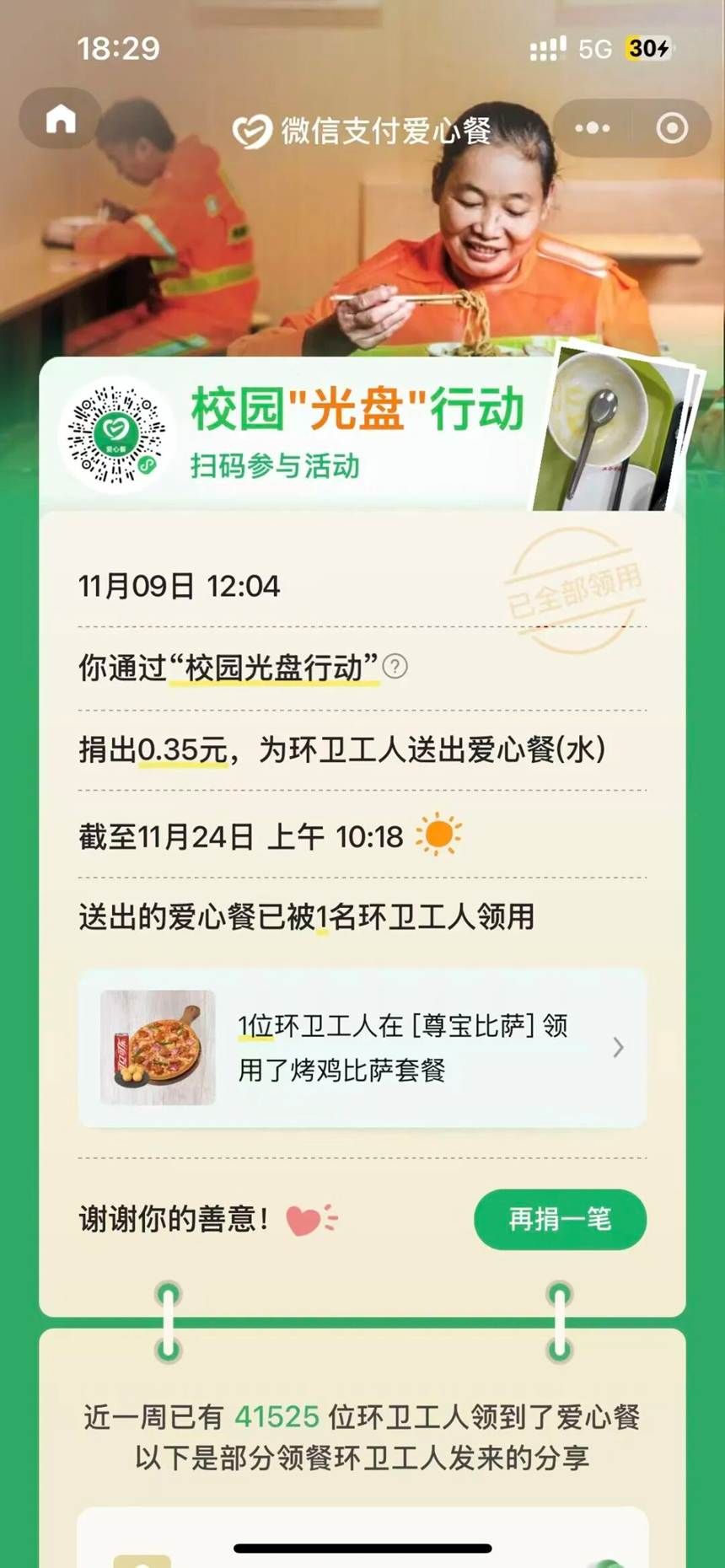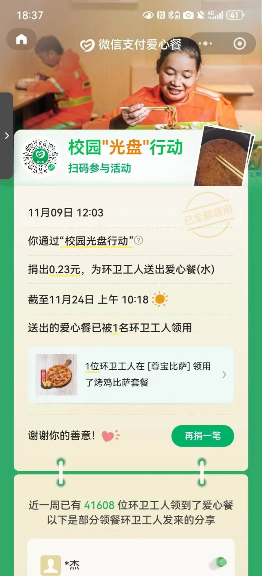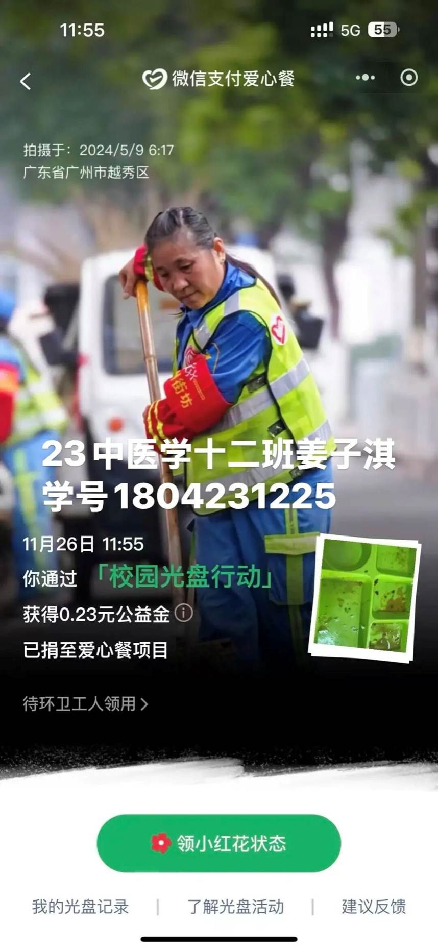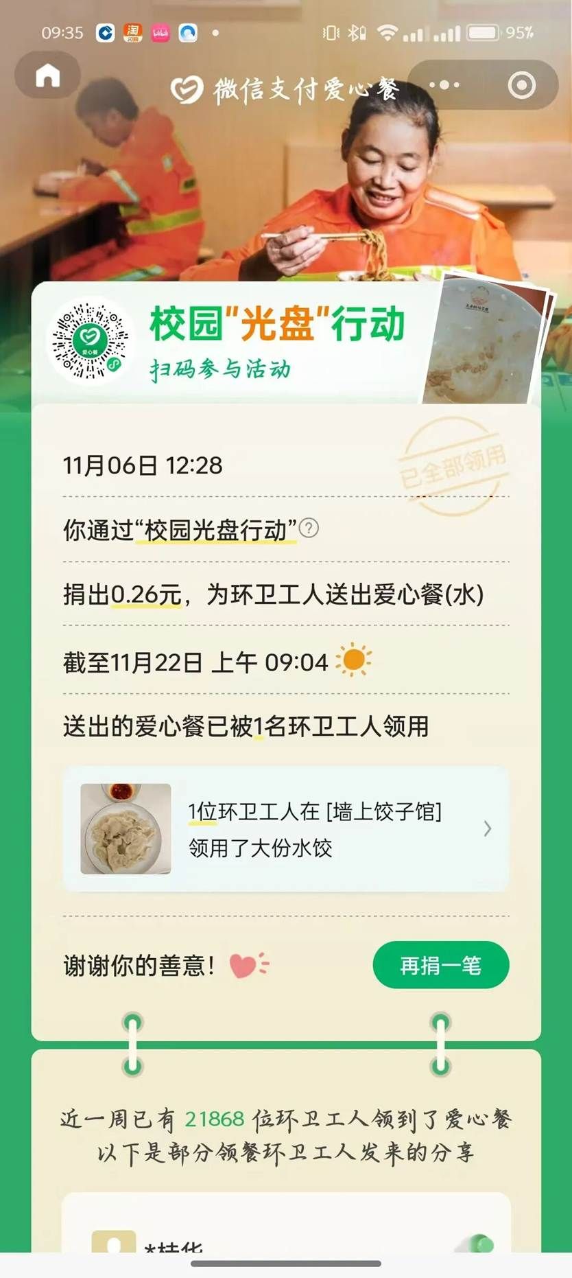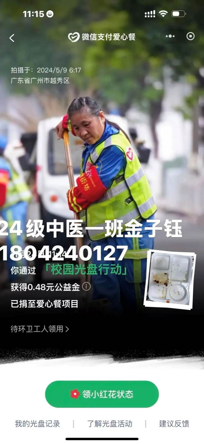 参与者通过日常打卡:每日早中晚三餐选择一餐后,并在打卡平台上传“光盘”照片,系统自动记录打卡天数。回顾活动全程,太多温暖与感动值得铭记。我们看到了同学们的成长与转变:有人从“习惯性剩饭”变成“按需取餐”,有人从“铺张点餐”变成“理性下单”。从活动启动时的积极报名,到每日一餐后准时上传的“空碗”照片,从群里分享的“剩菜变身技巧”,到相互鼓励的打卡留言,每一位参与者都用实际行动诠释着“珍惜粮食”的深刻内涵。