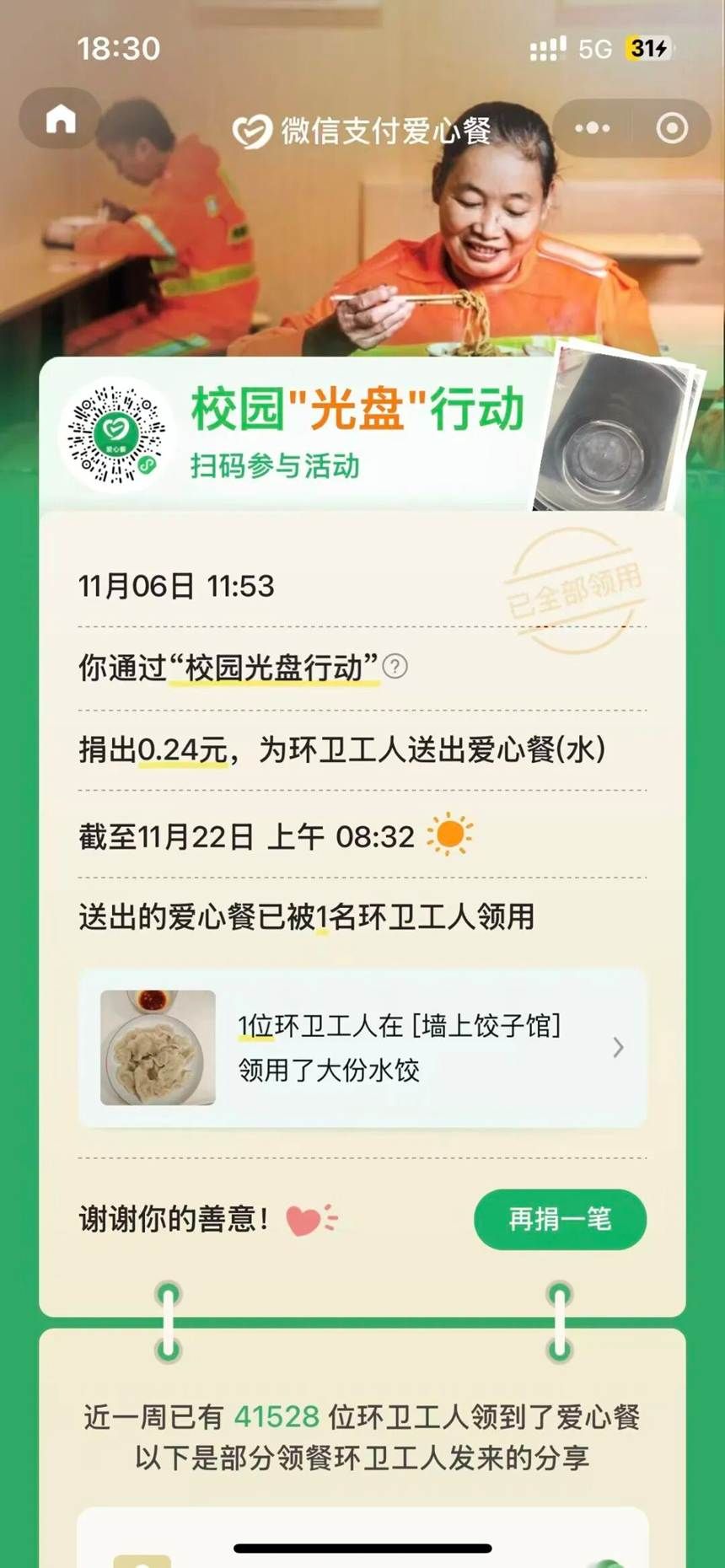 为引导同学们树立“珍惜粮食”的责任意识,将节约行动融入日常用餐场景,我院心连心志愿者协会秉持“节约即公益”的核心理念,推动节约粮食文化与公益事业深度融合,以线上打卡为载体打造“惜食有节,光盘有礼”主题活动。活动历时7天,得到了同学们的积极响应与热情参与,大家用实际行动践行光盘承诺,累计捐出814.25元善款。此次活动让节约美德扎根校园日常,让每一次光盘都赋予公益价值,既助力养成勤俭节约的用餐新风尚,更凝聚起“人人讲节约、公益助人人”的青春力量。