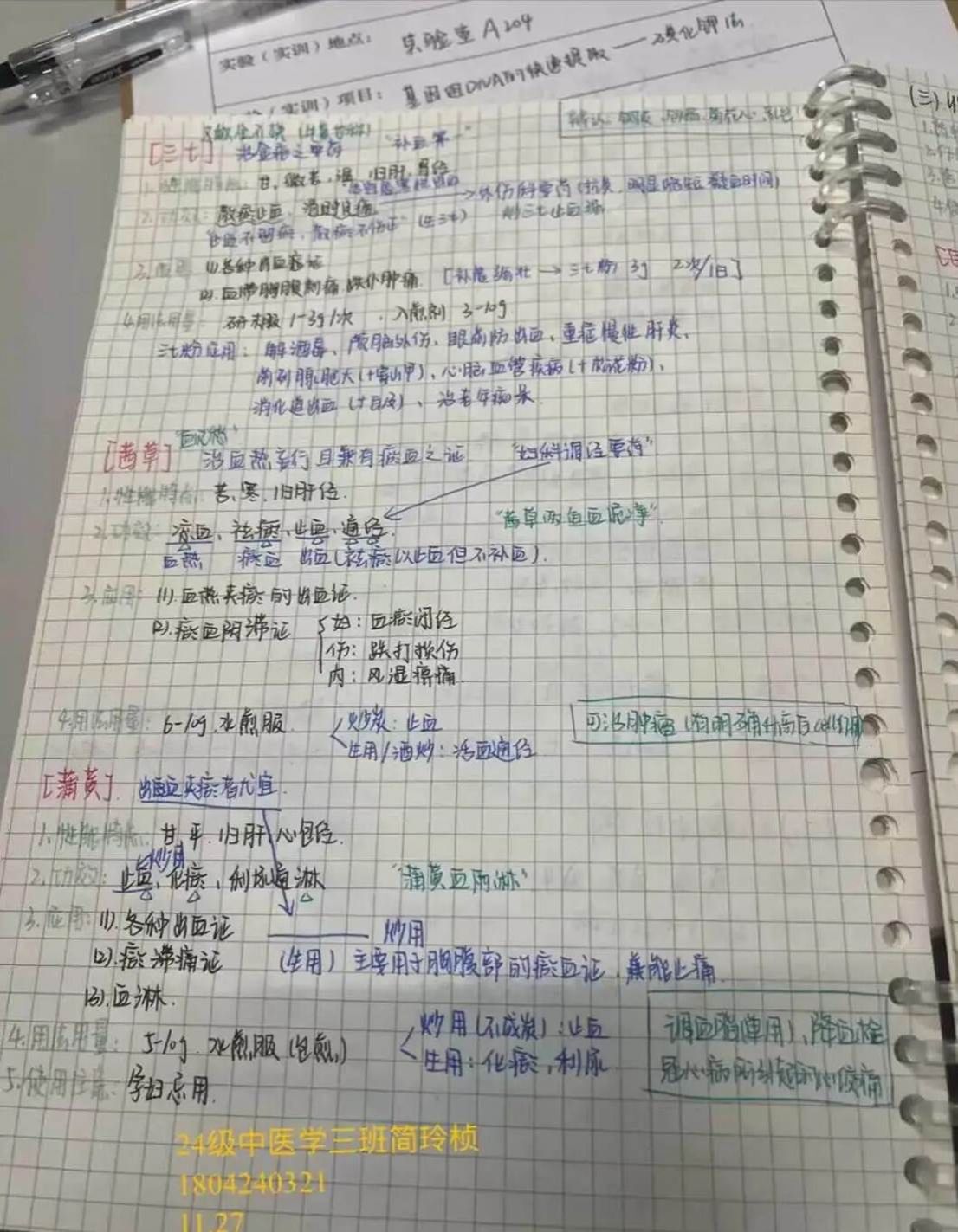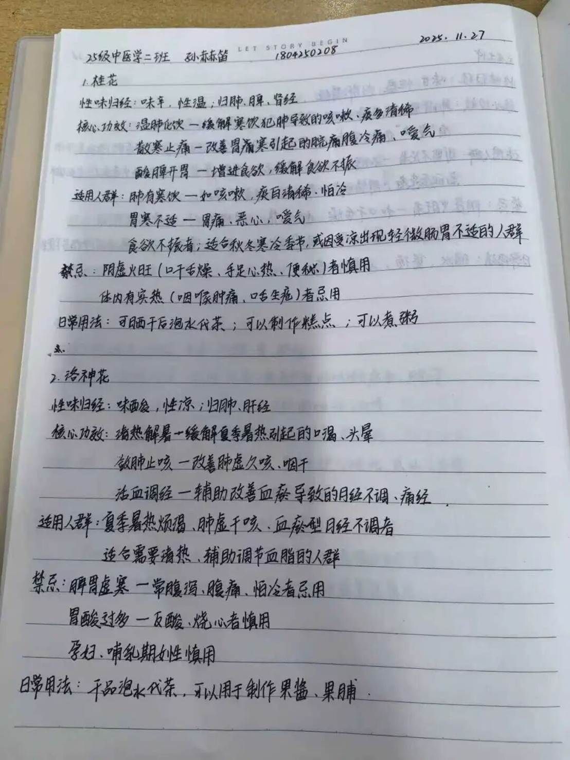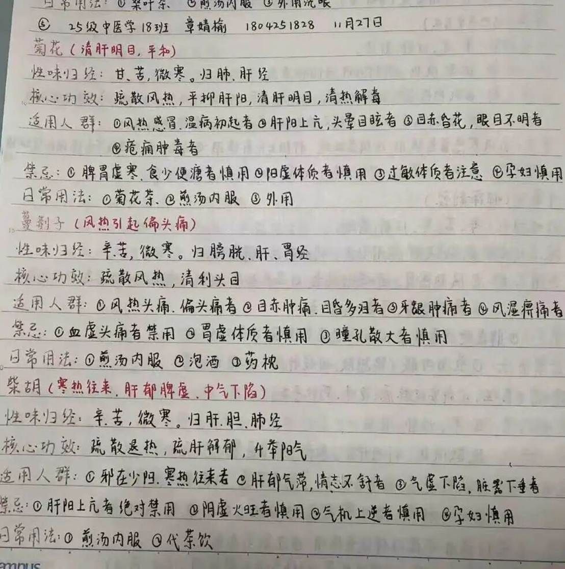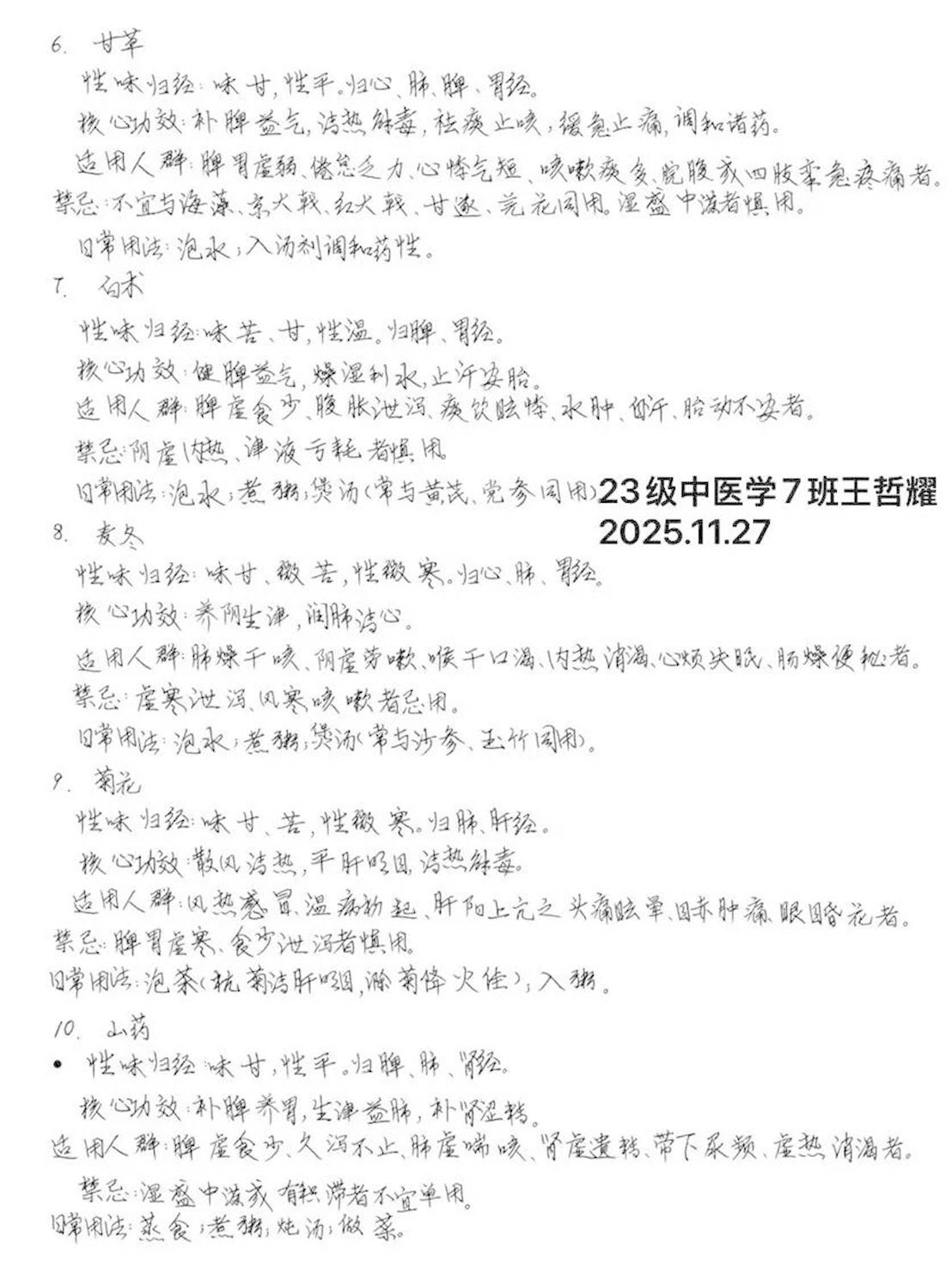 活动以“碎片化学习+打卡积累”为核心模式,为同学们搭建了轻量化、系统化的中药学习平台。参与同学每日深耕一味中药,手写记录药材的性味归经、核心功效、适用人群、禁忌及日常用法,以清晰的笔记、规整的排版展现学习成果,并按时在活动群完成打卡。7天里,大家主动查阅书籍、搜集线上资料,在自主探索中积累知识;工作人员严格核查打卡内容,杜绝抄袭与虚假打卡,保障了活动的公平公正。一张张翔实的手写笔记、一次次准时的打卡提交,不仅见证了同学们的坚持与成长,更在学院内营造出“每日学一点,积累成体系”的浓厚学习氛围。