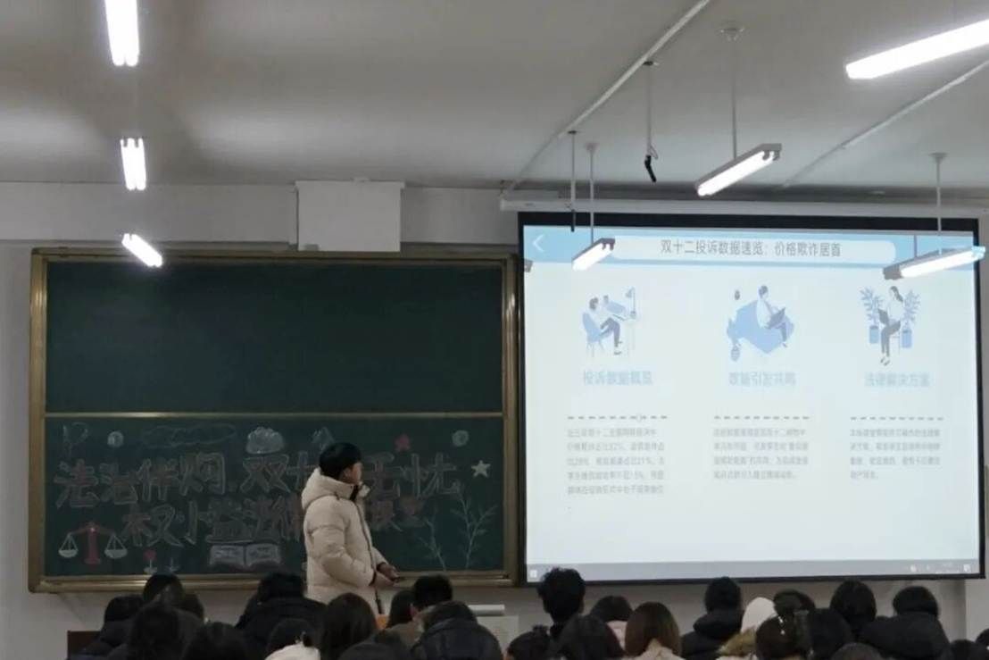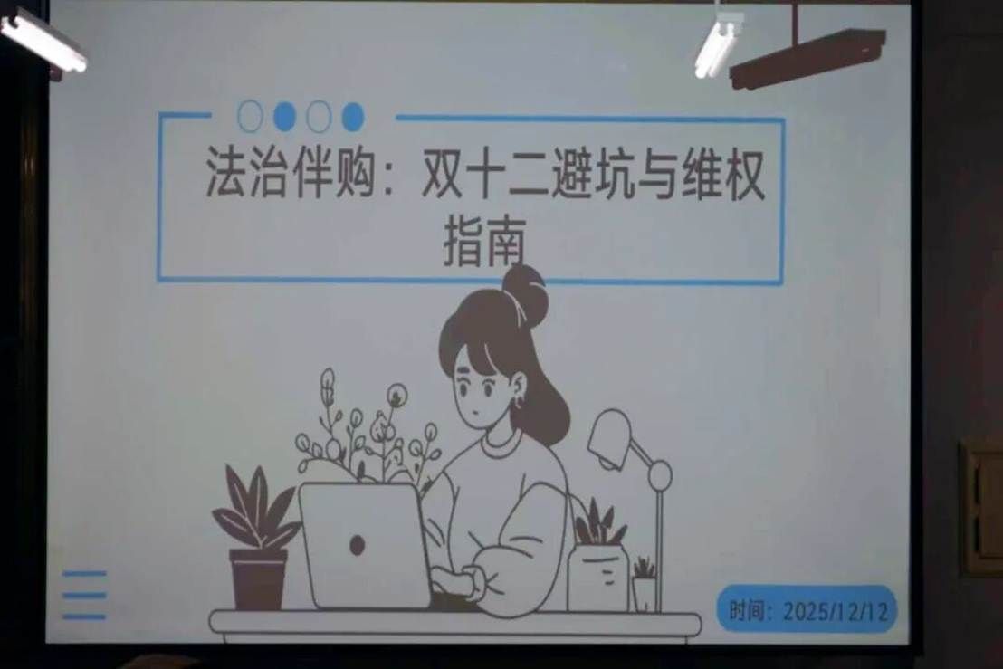 以双十二购物节点为契机,我院权益部聚焦同学们的消费安全需求,于2025年12月12日在第五教学楼315教室开展本次法治伴购活动。活动旨在普及消费维权法律知识,帮助大家识别购物中的隐藏陷阱、掌握实用维权方法,引导形成理性消费的良好风尚,最大限度减少同学们的财产损失。