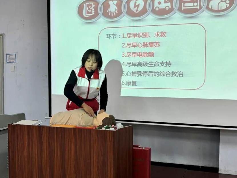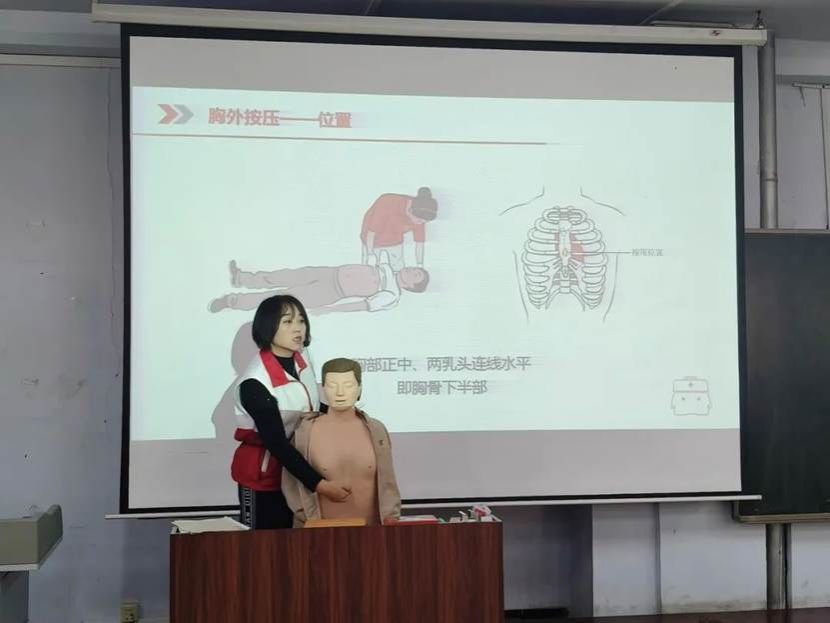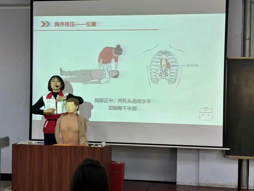 授课中,张蕾老师结合校园安全特点,构建“理论讲解+实操演练+案例分析”的培训体系。针对安全监理员的岗位职责,重点阐释校园安全隐患排查流程,突发事件预警机制等核心内容,明确安全监理员在人员疏导、物资保障、信息传达中的关键作用;围绕预备役教官的工作需求,聚焦中暑、扭伤、突发性疾病等高频应急场景,详细拆解判断标准与处置流程,现场演示心肺复苏(CPR)、止血包扎、伤员搬运等急救技能的操作规范。