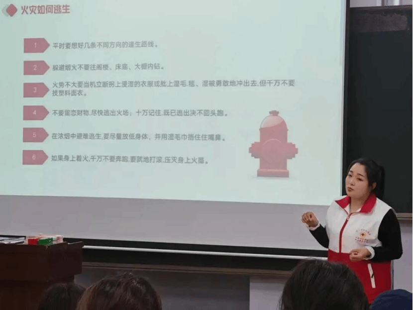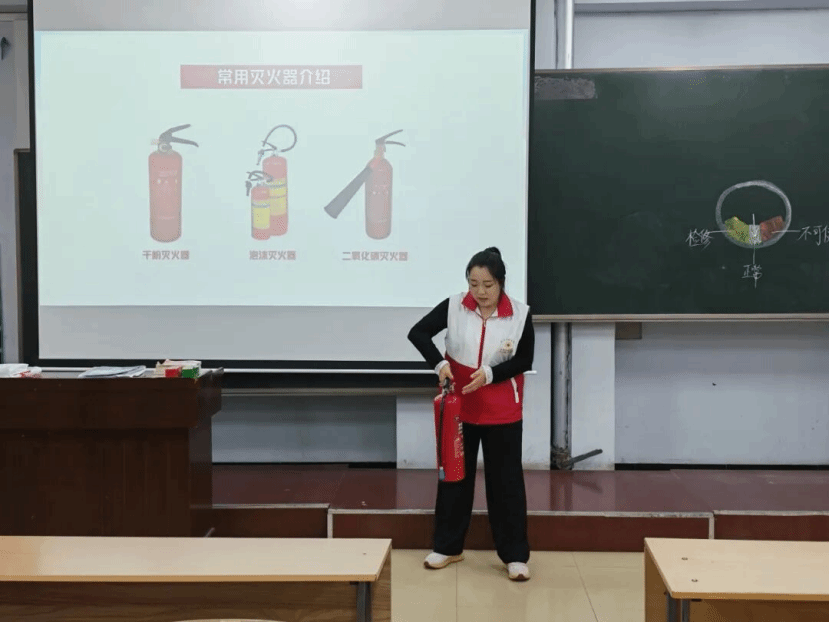 活动现场,协会骨干孟常云结合校园火灾案例,以通俗易懂的语言从火灾预防、初期火情扑救、疏散逃生技巧、消防器材使用等核心内容展开讲解。通过PPT演示、视频播放等形式,直观展示了违规用电、易燃物品存放等常见安全隐患的危害,详细拆解了“弯腰低姿、湿巾捂鼻、沿疏散指示标识逃生”等关键逃生步骤,并现场演示了干粉灭火器“提、拔、握、压”的正确操作方法。