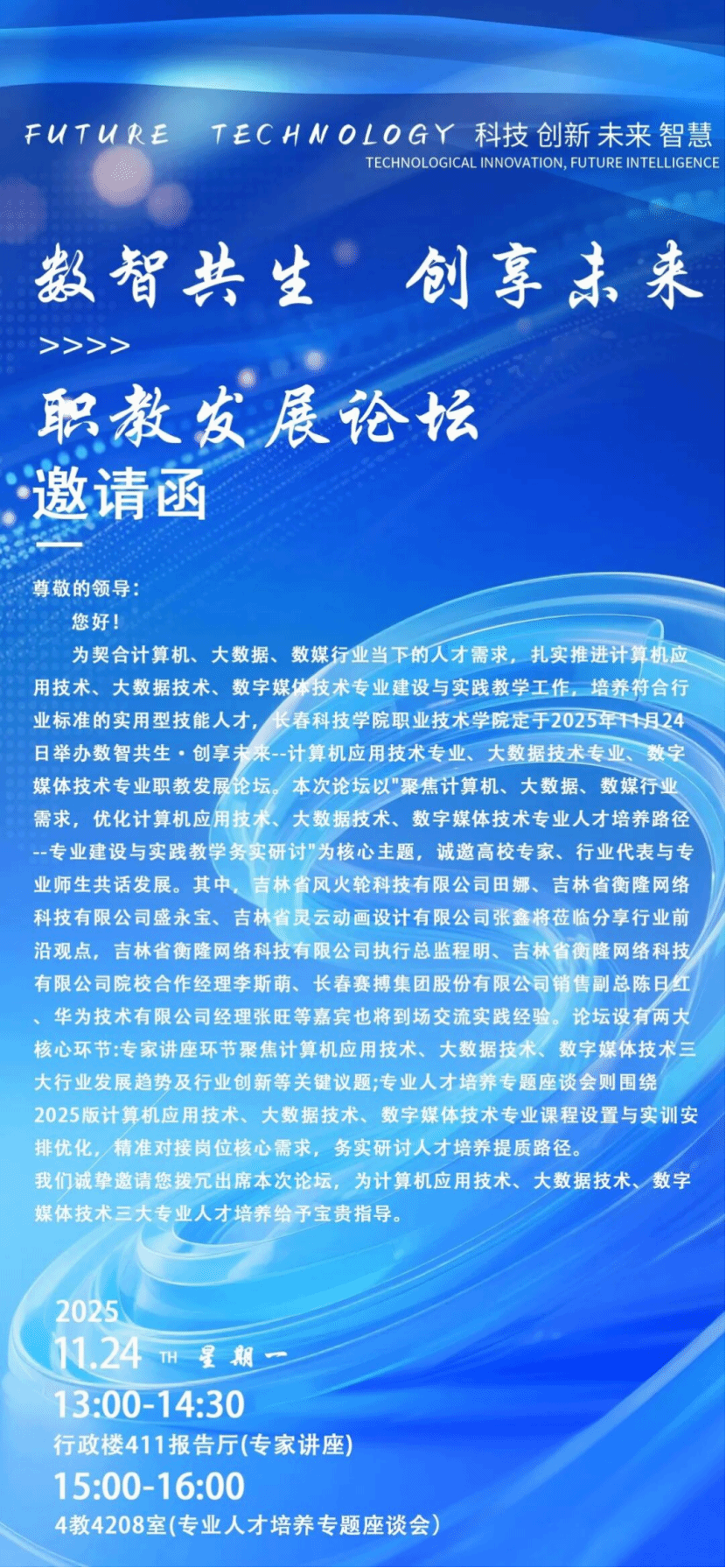 为落实学院职业教育高质量发展部署,精准对接行业人才需求,持续提升计算机应用技术、大数据技术、数字媒体技术专业建设质量与实践教学水平,培育符合行业标准的高技能人才,经研究,决定举办2025年数智共生・创享未来--计算机应用技术专业、大数据技术专业、数字媒体技术专业职教论坛。现将有关事宜通知如下: