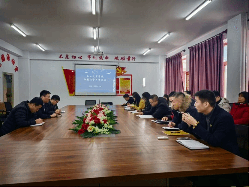 2025年12月5日职业技术学院在3113会议室组织召开假前安全工作专题会议。此次会议紧扣学期收尾与寒假前安全管理关键节点,旨在筑牢校园安全防线、提升学生安全意识,全面部署安全防控任务,压实各环节安全责任。学院党总支副书记、副院长王东红出席会议并讲话,学院分团委书记韩朋及全体辅导员参加会议。会议由学工办主任杜锐主持。