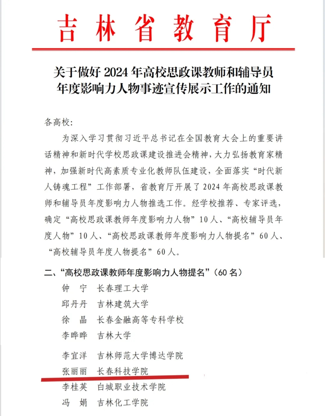 根据《关于做好2024年高校思政课教师和辅导员年度影响力人物事迹宣传展示工作的通知》,我校马克思主义学院张丽丽老师喜获“2024年吉林省高校思政课教师年度影响力人物提名”。 张丽丽老师在长期的思政课教学实践中,...