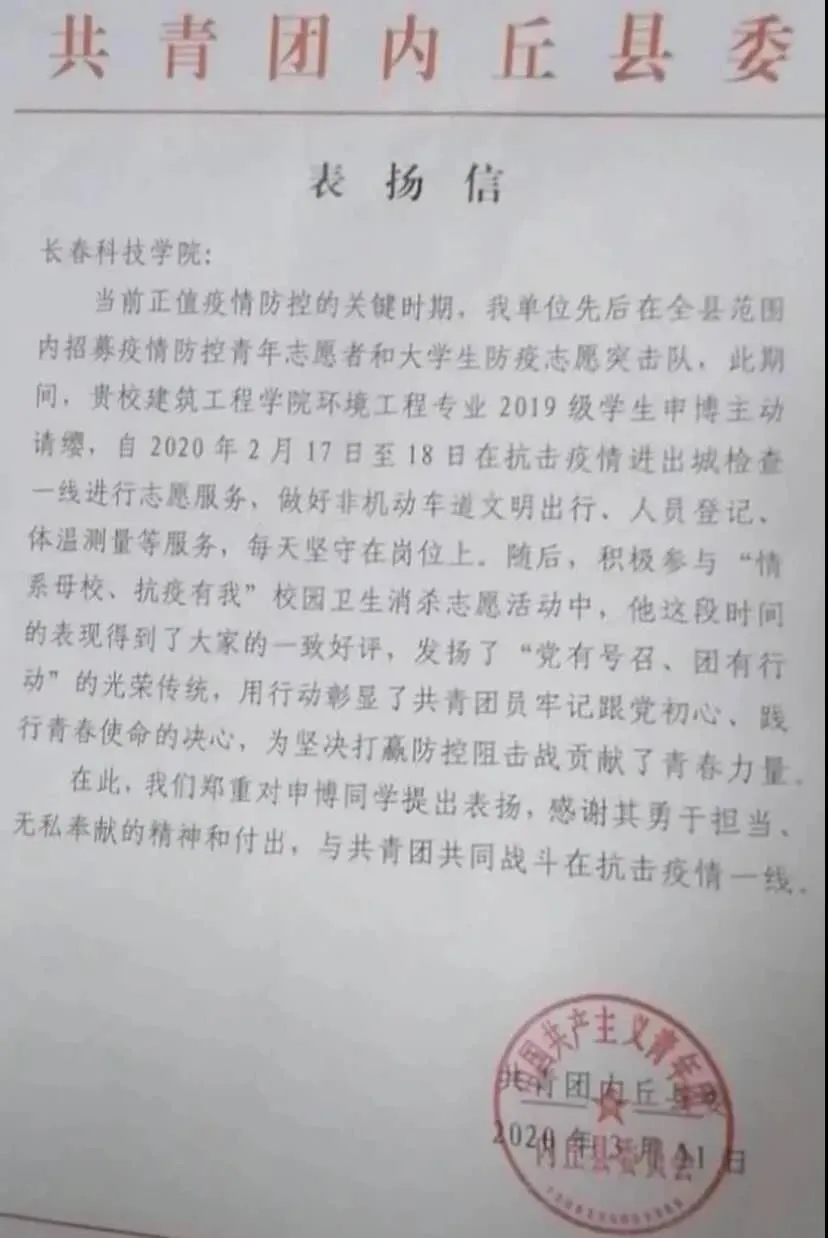 “贵校建筑工程学院环境工程专业2019级学生申博主动请缨,自2020年2月17日至18日在抗击疫情进出城检查线进行志愿服务,做好非机动车道文明出行、人员登记体温测量等服务,用行动彰显了共青团员牢记跟党初心、践行青春使命决心…...