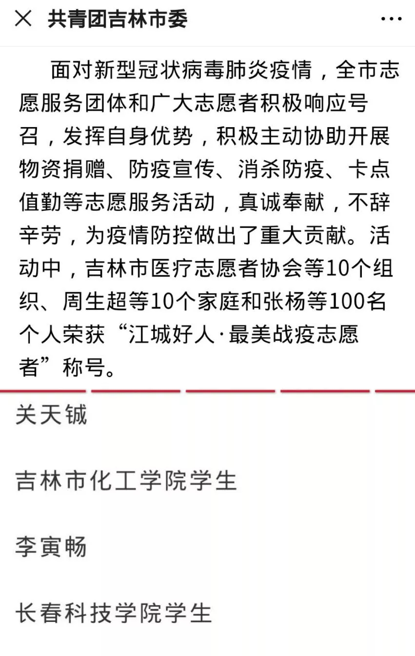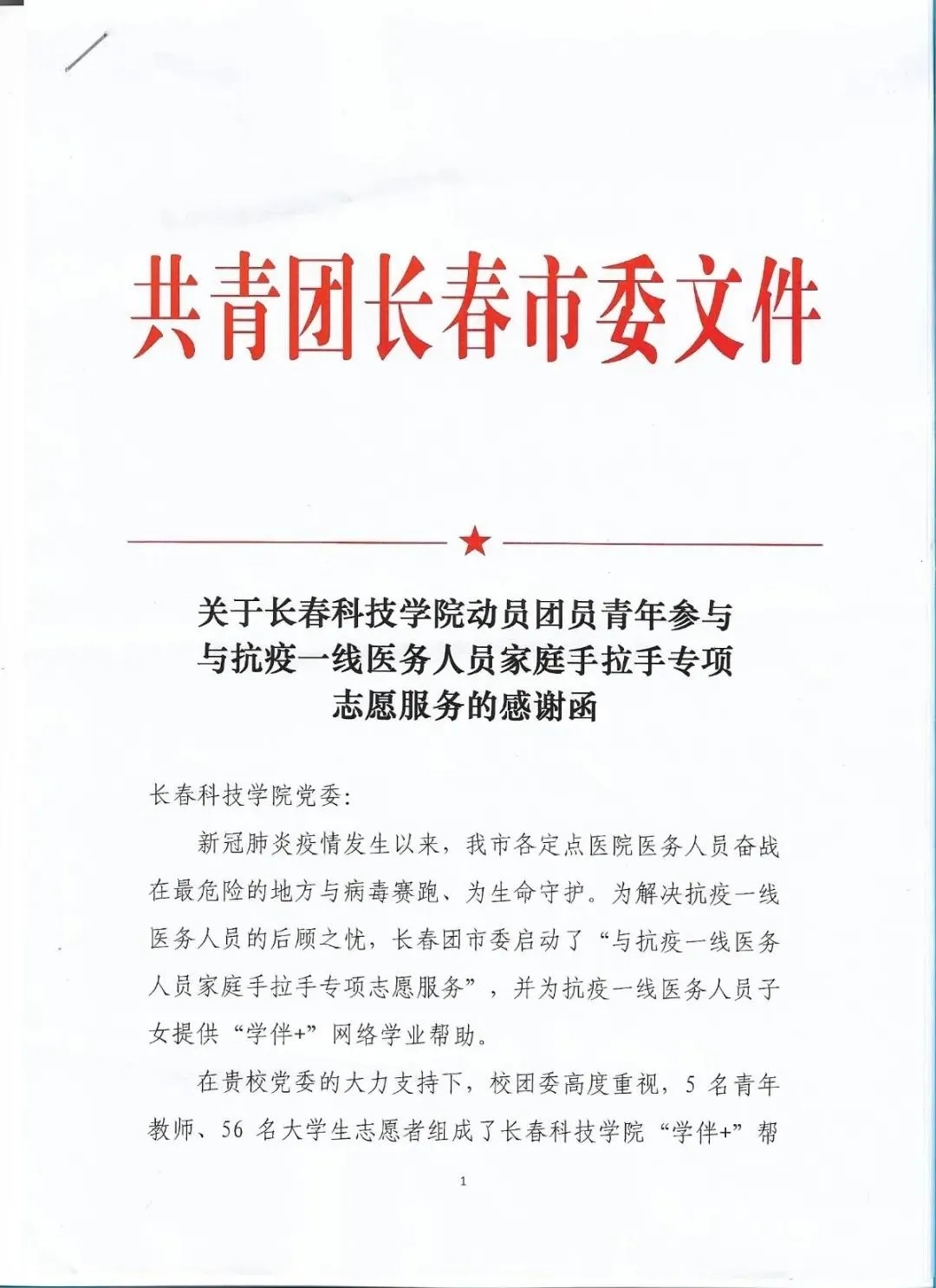 “在贵校党委的大力支持下,在校团委高度重视下下,5名青年教师、56名大学生志愿者组成了长春科技学院“学伴”帮帮团,为双阳区人民医院抗疫一线医务人员子女提供志愿服务……在此,向贵校党委长期以来对共育团工作的大力支持表示感谢,...