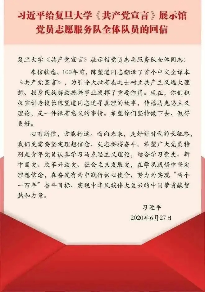 “心有所信,方能行远。面向未来,走好新时代的长征路,我们更需要坚定理想信念、矢志拼搏奋斗。” 6月27日, 中共中央总书记、国家主席、中央军委主席习近平给复旦大学《共产党宣言》展示馆党员志愿服务队全体队员回信,...