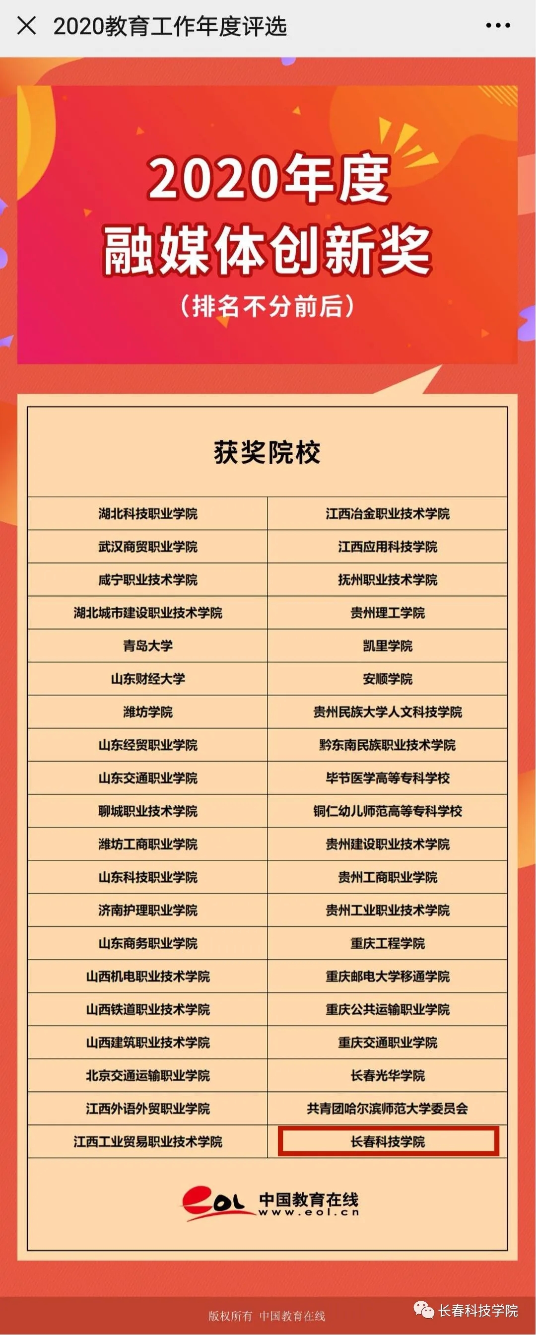 近日,中国教育在线·掌上高考“榜样力量——2020年度教育盛典”评选获奖名单揭晓,长春科技学院荣获“2020年度吉林省最受中学信赖本科高校”奖。 据悉,本次评选设本科、高职、高中、中职四大类共16个奖项。...