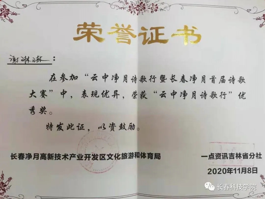 近日,“云中净月诗歌行暨长春净月首届诗歌节”活动获奖名单出炉,我校上报的《净月晨》、《净月》、《遇见净月》等7件作品获得优秀奖,获奖作品均被收录诗集。 近年来,学校重视优秀传统文化活动的开展与参与,...