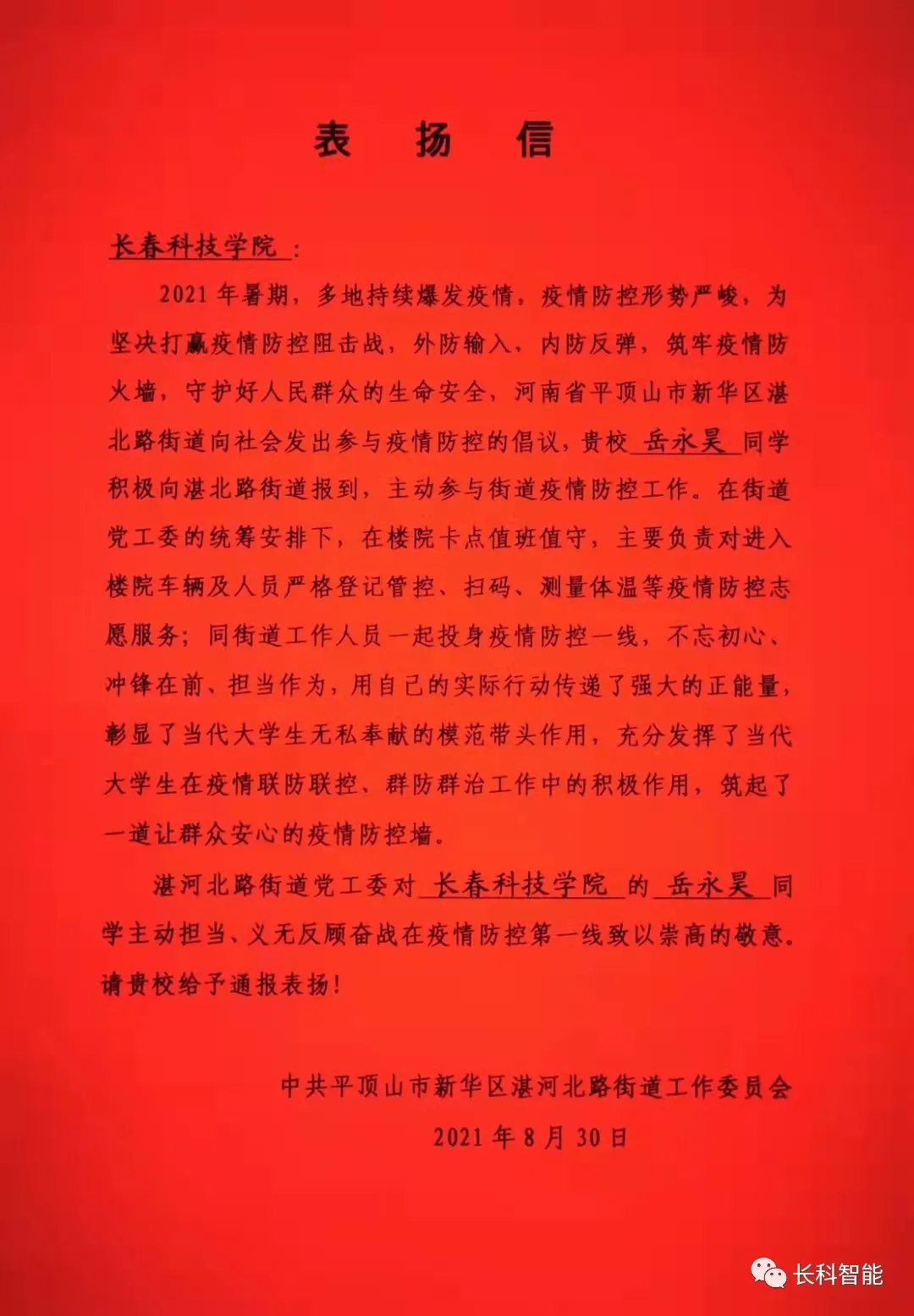 近日,我院收到中共平顶山市新华区湛河北路街道工作委员会送来的表扬信,为在疫情形势严峻时主动参与到疫情防控工作中的岳永昊同学表示衷心的感谢和高度赞扬。 岳永昊是智能制造学院2021级学生,...