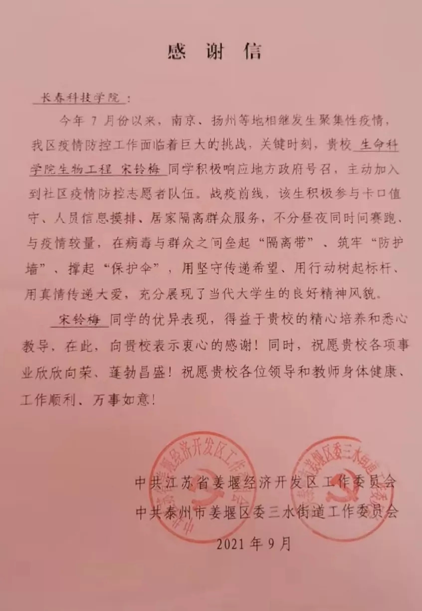 涓涓细流汇江海,众志成城抗疫情。自新冠肺炎疫情爆发以来,我院有无数的青年学子投身于疫情防控这场战役之中。近日,我院收到中共泰州市姜堰区委三水街道工作委员会送来的表扬信,对积极响应号召,主动参与到疫情防控工作中的宋铃梅同学表达了衷心的感谢和高度赞扬。...
