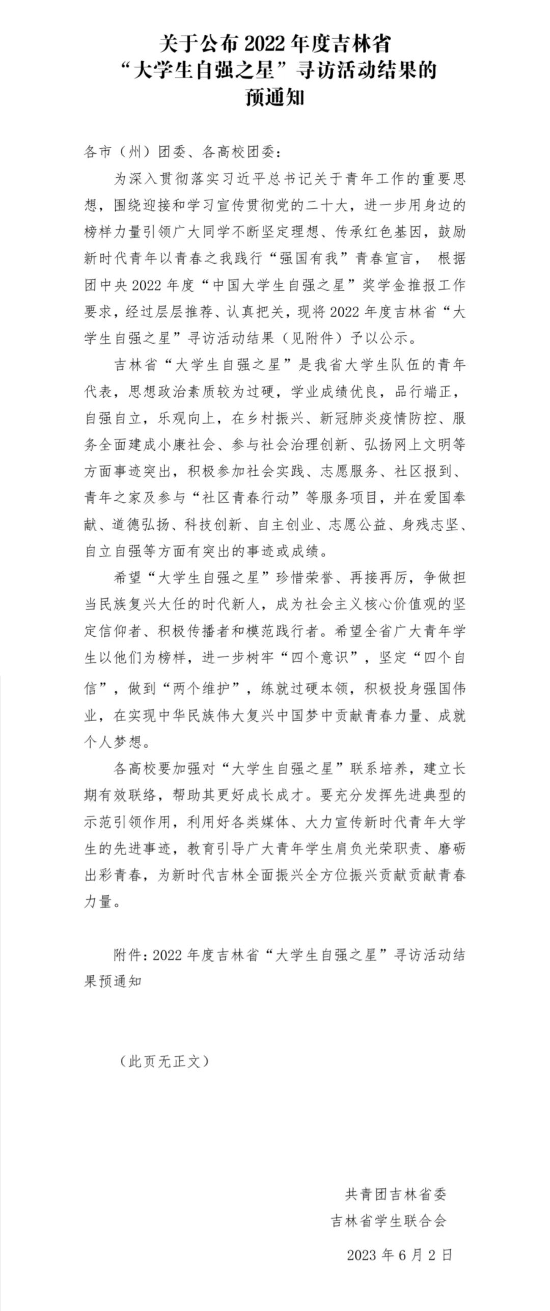 近日,共青团吉林省委、吉林省学生联合会联合开展2022年度吉林省“大学生自强之星”寻访活动。 我校宛情同学获2022年度奋斗力行类别吉林省“大学生自强之星”称号。 2022 年吉林省“大学生自强之星”寻访活动结果 ...