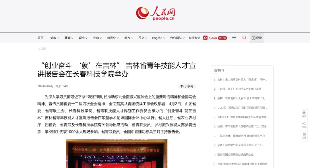 为深入学习贯彻全国两会精神,积极响应省委“创业奋斗就在吉林”的号召,4月2日,吉林省青年技能人才宣讲报告会在长春科技学院东鳌学术论坛—国际会议中心举行。 人民网 点击链接查看原文:...