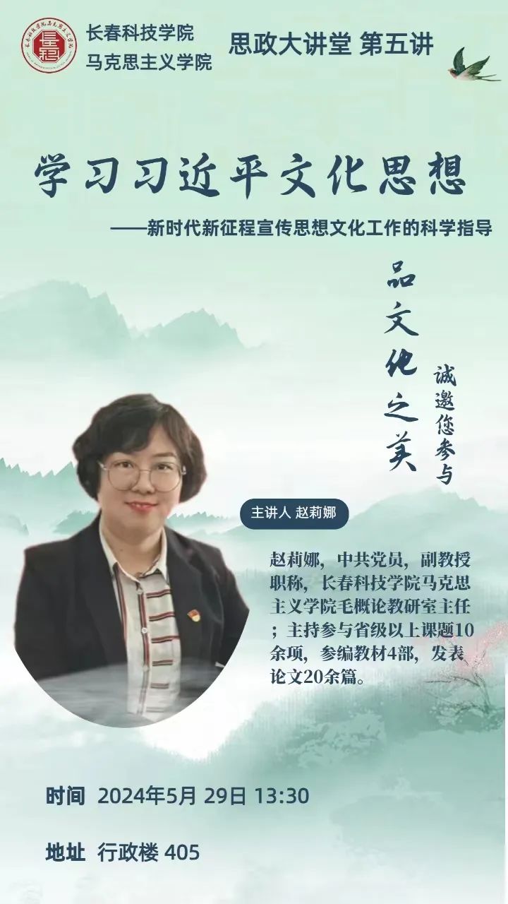 习近平文化思想,是新时代党领导文化建设实践经验的理论总结,丰富和发展了马克思主义文化理论,是习近平新时代中国特色社会主义思想的文化篇,思政课教师深入学习领会习近平文化思想的丰富内涵。5月29日下午13:30,在行政楼605会议室“...