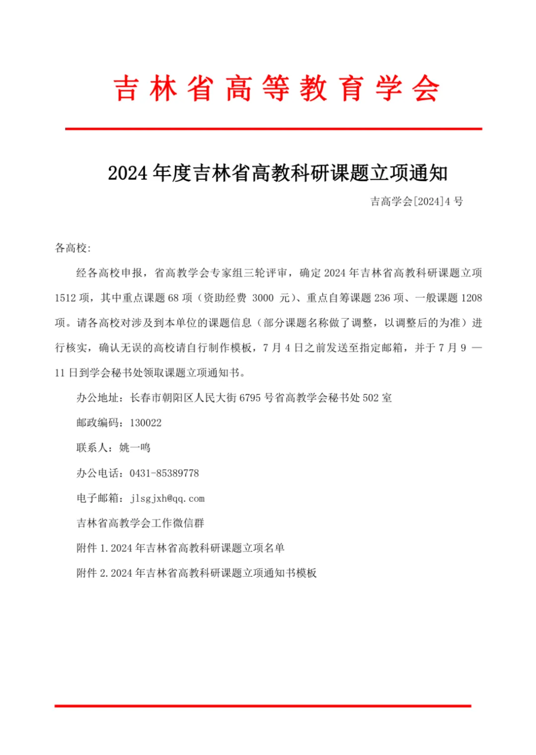 近日,吉林省高等教育学会发布了《2024 年度吉林省高教科研课题立项通知》(吉高学会[2024]4号),我校2024年度吉林省高教科研课题获批立项89项,立项数量位居全省高校第一!其中获批学生专项48项,实现了学校在学生科研立项数量上的历史性突破!...