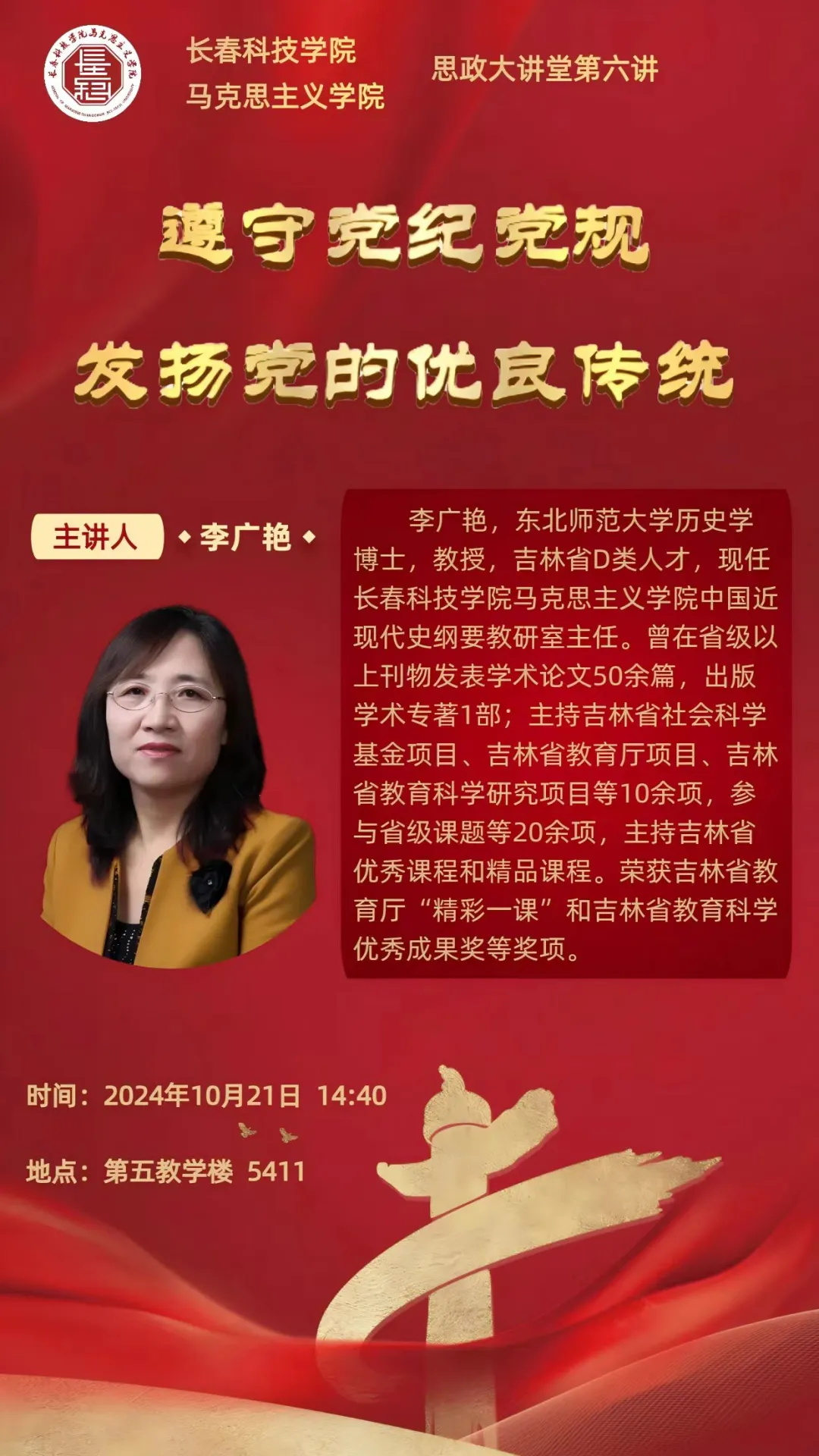 党纪党规,是党的生命线。它规范着党员的行为,确保党的先进性和纯洁性。为深入学习贯彻习近平总书记关于全面加强党的纪律建设的重要论述,扎实推进党纪党规学习教育常态化。10月21日下午在第五教学楼5411教室“长科思政大讲堂”...