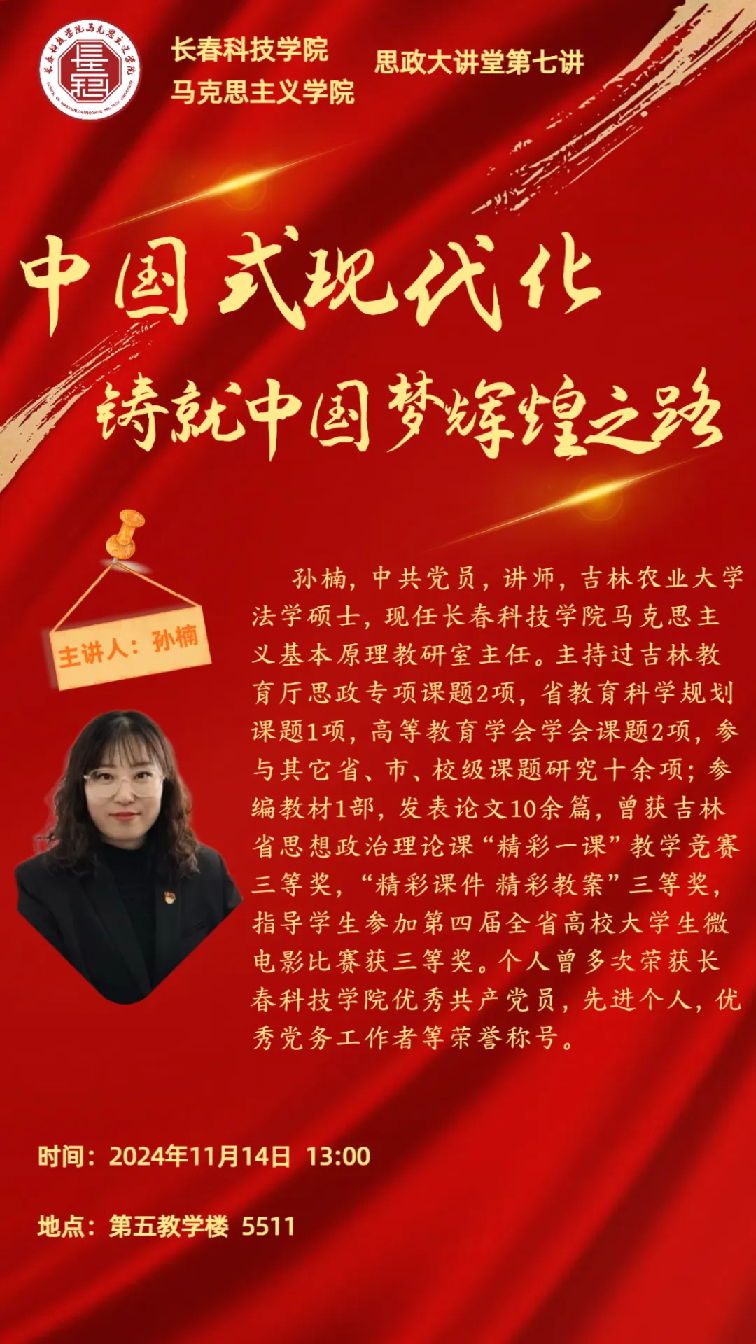 现代化是一个世界性潮流,实现现代化是各国人民的共同向往。中国式现代化的成功推进和拓展,为中华民族伟大复兴开辟了广阔前景,为人类实现现代化提供了新的选择。11月14日下午在第五教学楼5511教室“长科思政大讲堂”...