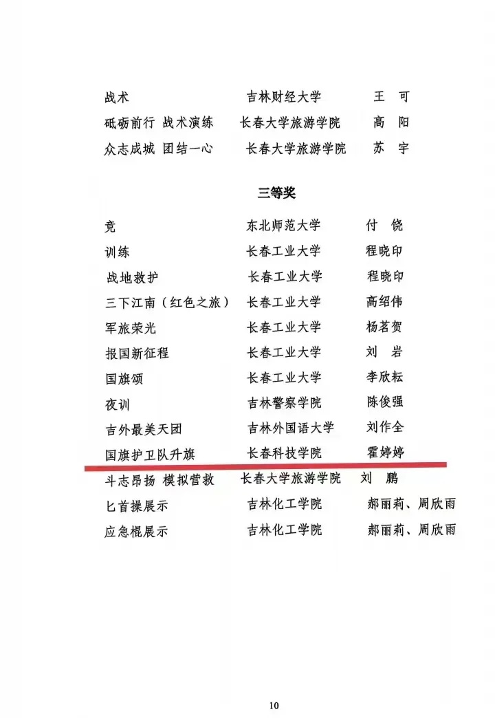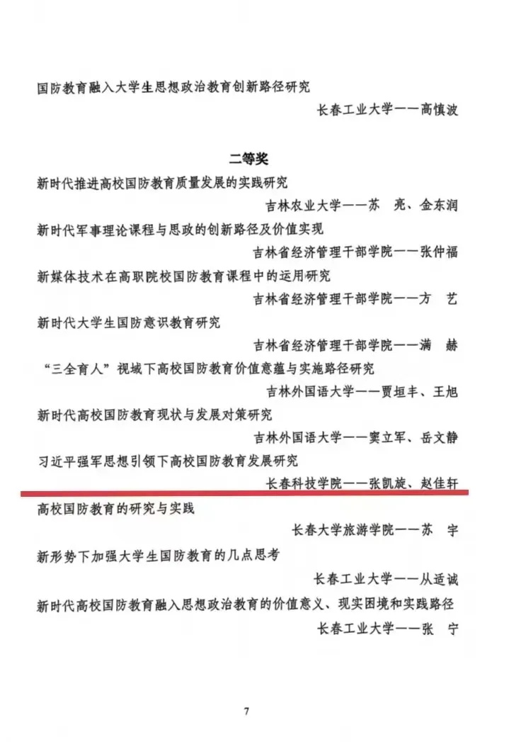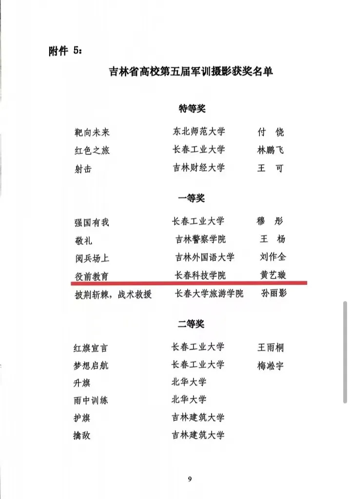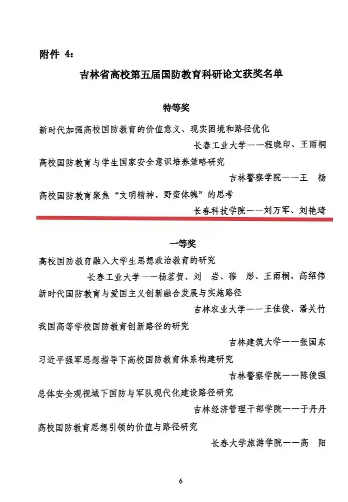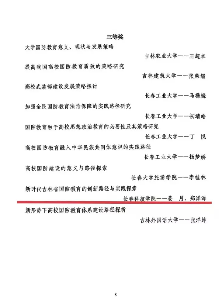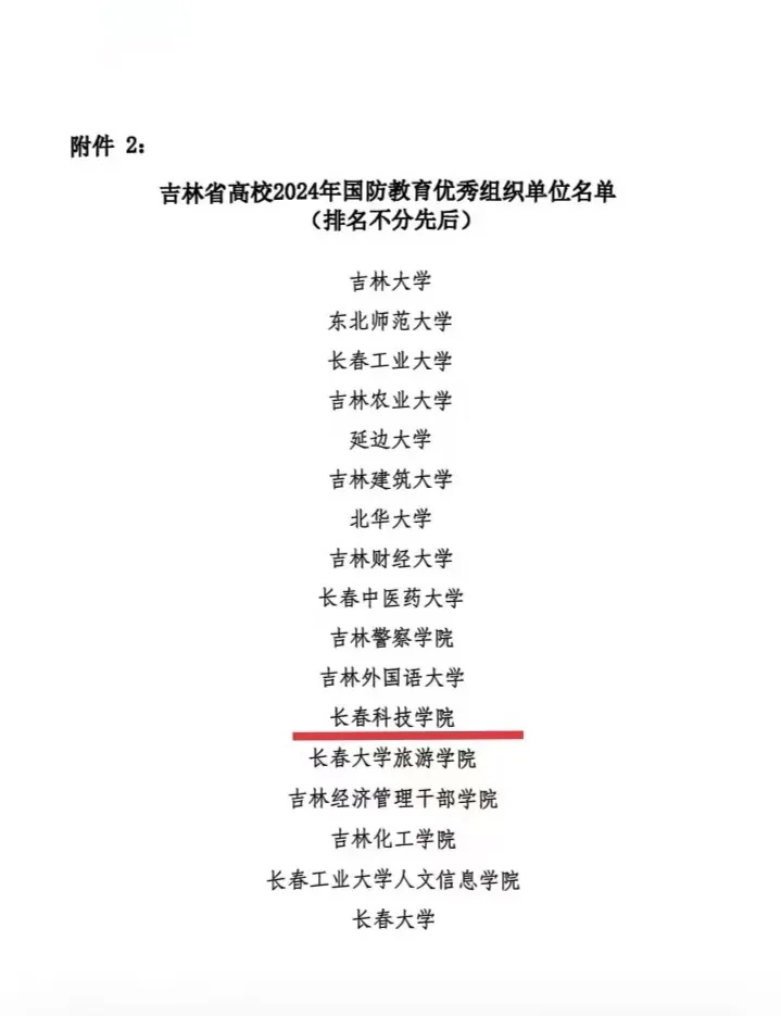 近日,吉林省高等教育学会国防教育专业委员会公布了吉林省高校2024年度国防教育优秀组织单位名单、第五届国旗仪仗队、第五届国防教育科研论文、第五届军训摄影等各项获奖名单,长春科技学院及部分在校师生荣获多项荣誉。