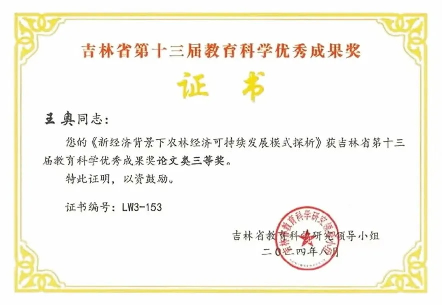 为总结近年来我省教育科研领域取得的优秀研究成果,树立精品意识,引领教育科研发展方向,调动广大教育科研工作者投身教育科研的积极性,以高质量科研成果推动教育强国建设和中国式现代化建设,经研究吉林省教育科学研究领导小组决定在全省开展第十三届教育科学研究优秀成果评奖工作。本届评奖共设研究成果奖项550项,设著作类、论文类、决策咨询类三个类别,并分别设置一等奖、二等奖、三等奖。经济与管理学院教师王奥的论文《新经济背景下农林经济可持续发展模式探析》获吉林省第十三届教育科学优秀成果奖论文类三等奖。