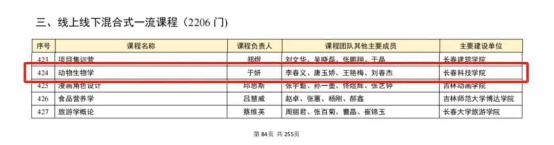2025年8月21日,根据教育部高等教育司《关于第三批国家级一流本科课程认定结果的公示》通知,长春科技学院生命科学学院于妍教授主持的《动物生物学》课程获批线上线下混合式一流课程。截至目前,学校共有2门课程获批国家级一流本科课程。
