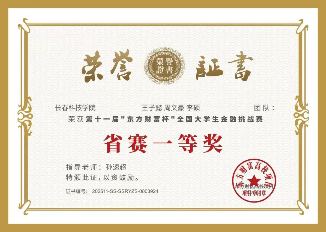 近日,金融工程专业学生王子懿作为操盘手带领队伍获得第十一届“东方财富杯”全国大学生金融挑战赛省赛一等奖;金融工程专业李净洋、刘嘉颖、王子懿团队获得省赛二等奖。