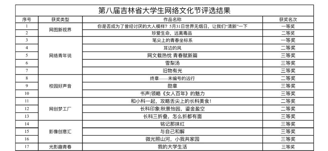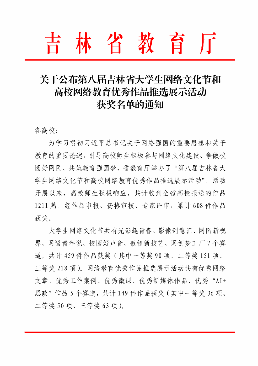 近日,吉林省教育厅公布“第八届吉林省大学生网络文化节和高校网络教育优秀作品推选展示活动”评选结果。学校共有20件作品入选,其中省级一等奖2项、二等奖6项、三等奖12项。