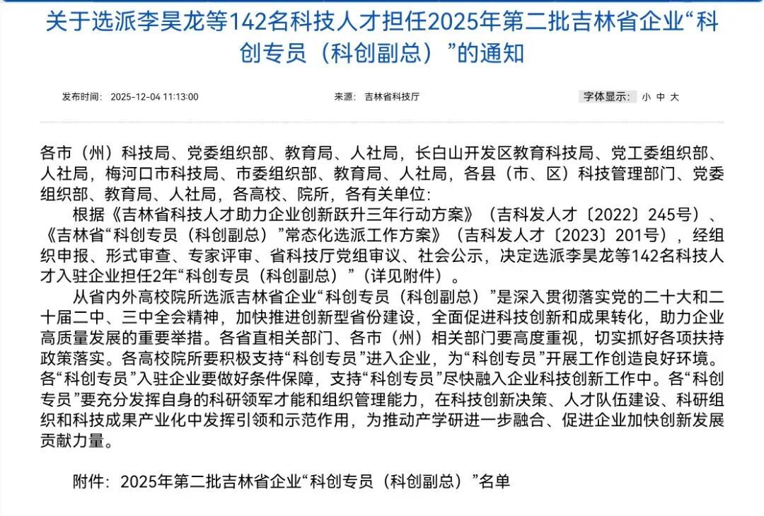 依据《吉林省科技人才助力企业创新跃升三年行动方案》和《吉林省“科创专员(科创副总)”常态化选派工作方案》,经申报审核、专家评审、省科技厅党组审议和公示,学校贾冬舒、孙永杰2位科技人才被正式选派入企。