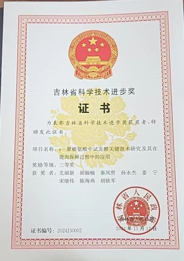 近日,吉林省人民政府公布了2024年度吉林省科学技术奖获奖项目名单。生命科学学院尤丽新教授团队申报的《ε-聚赖氨酸中试发酵关键技术研究及其在鹿肉保鲜过程中的应用》荣获吉林省科学技术进步奖三等奖。