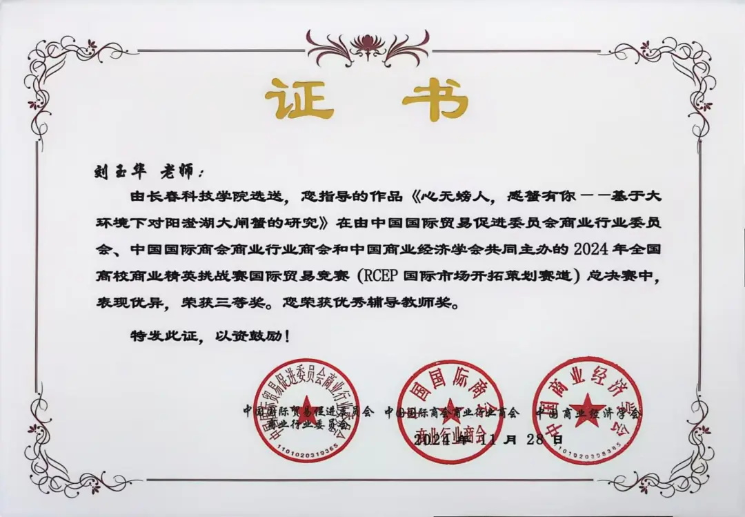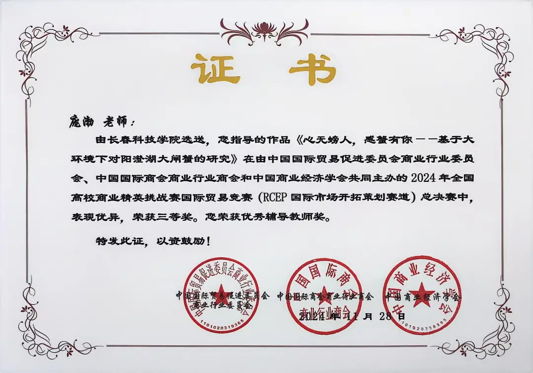 2024年全国高校商业精英挑战赛国际贸易赛道全国大赛于12月落下帷幕。我校金融工程专业两名教师荣获优秀辅导教师奖。