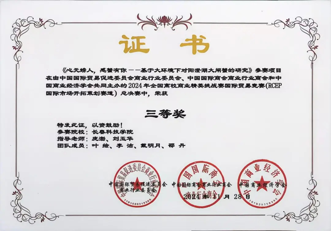 经过东北赛区的选拔,金融学专业学生叶绘、李洁、戴明月、邵丹的参赛项目《心无螃人、感蟹有你——基于大环境下对阳澄湖大闸蟹的研究》荣获全国总决赛三等奖,金融工程专业教师庞渤、刘玉华获优秀辅导教师奖。