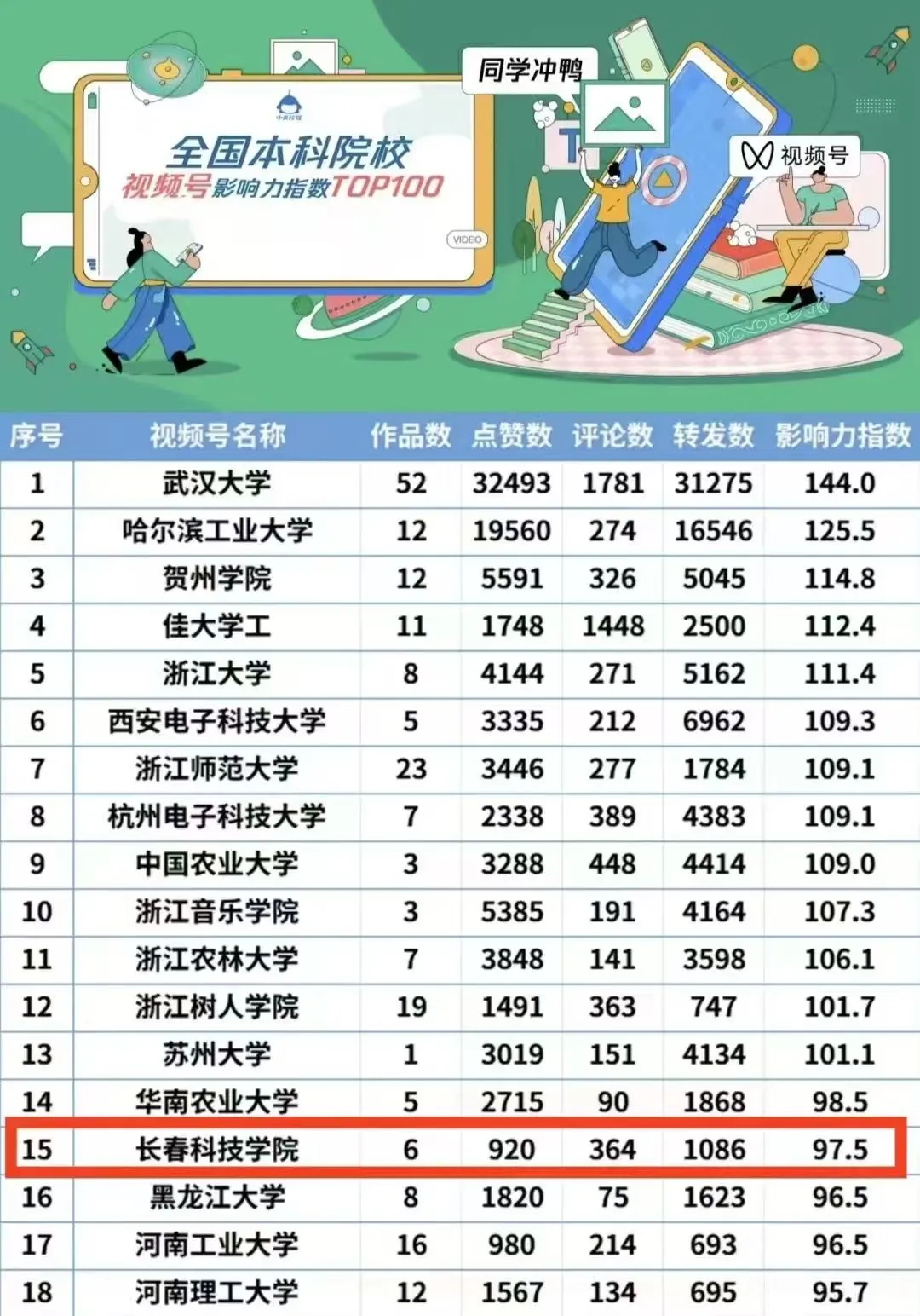 全国本科院校视频号影响力指数TOP前100