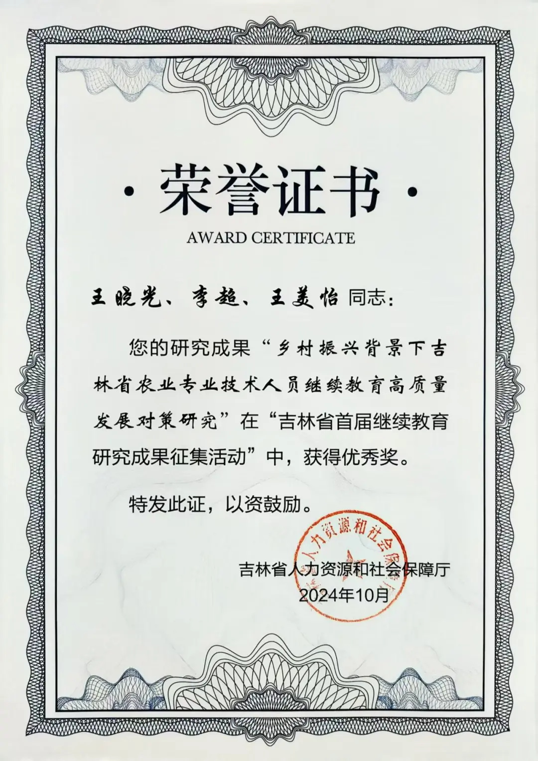 近日,在吉林省人力资源和社会保障厅组织的吉林省首届继续教育研究成果征集活动中,学院院长王晓光、人力资源管理专业主任李超、主任助理王美怡老师联合申报的“乡村振兴背景下吉林省农业专业技术人员继续教育高质量发展对策研究”项目,荣获优秀成果奖。