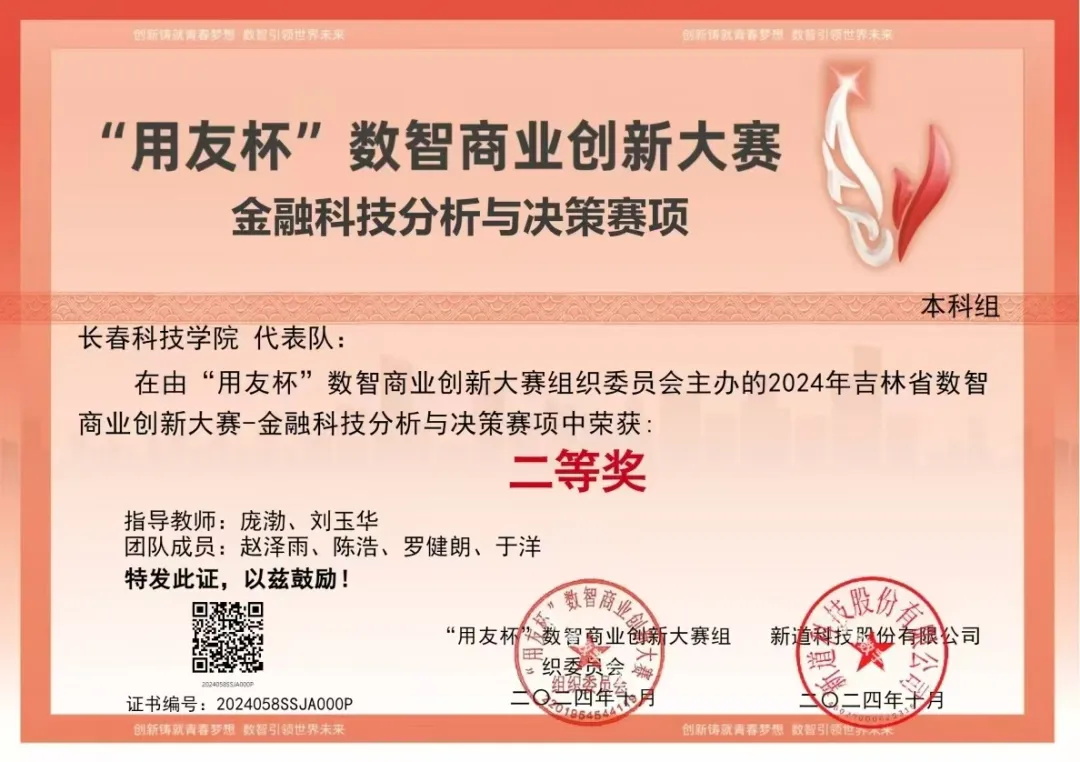 2024年10月中旬,“用友杯”吉林省数智商业创新大赛圆满落幕。我校金融工程专业参赛组荣获二等奖。