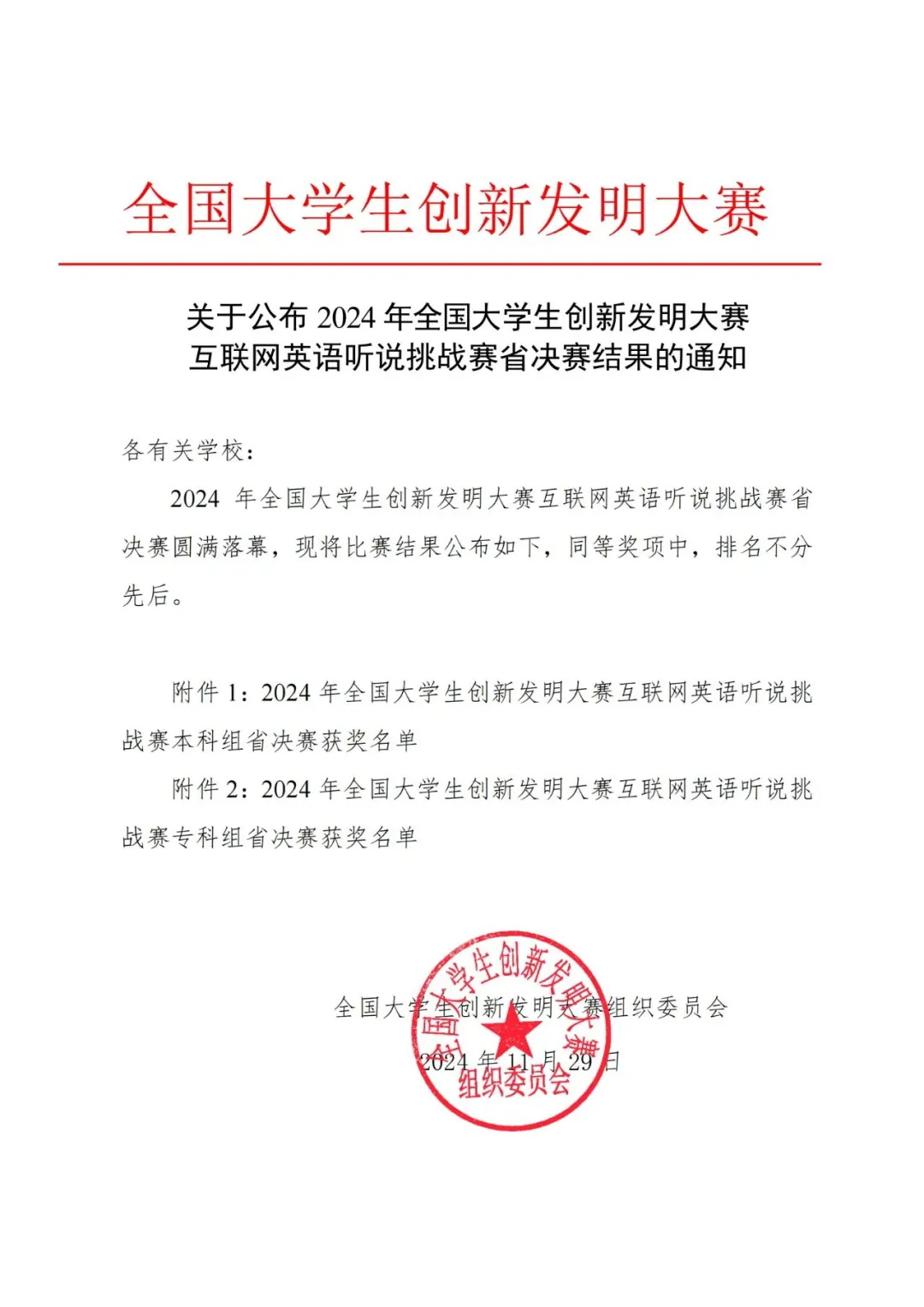 2024年全国大学生创新发明大赛互联网英语听说挑战赛自2024年7月开始宣传,我校共1204名同学报名参赛,比赛10月24日启动校级初赛,11月16日举办省赛,12月6日-8日将在南京进行线下全国决赛。通过校赛激烈的比拼,我校4名本科学生,2名专科学生进入省赛。